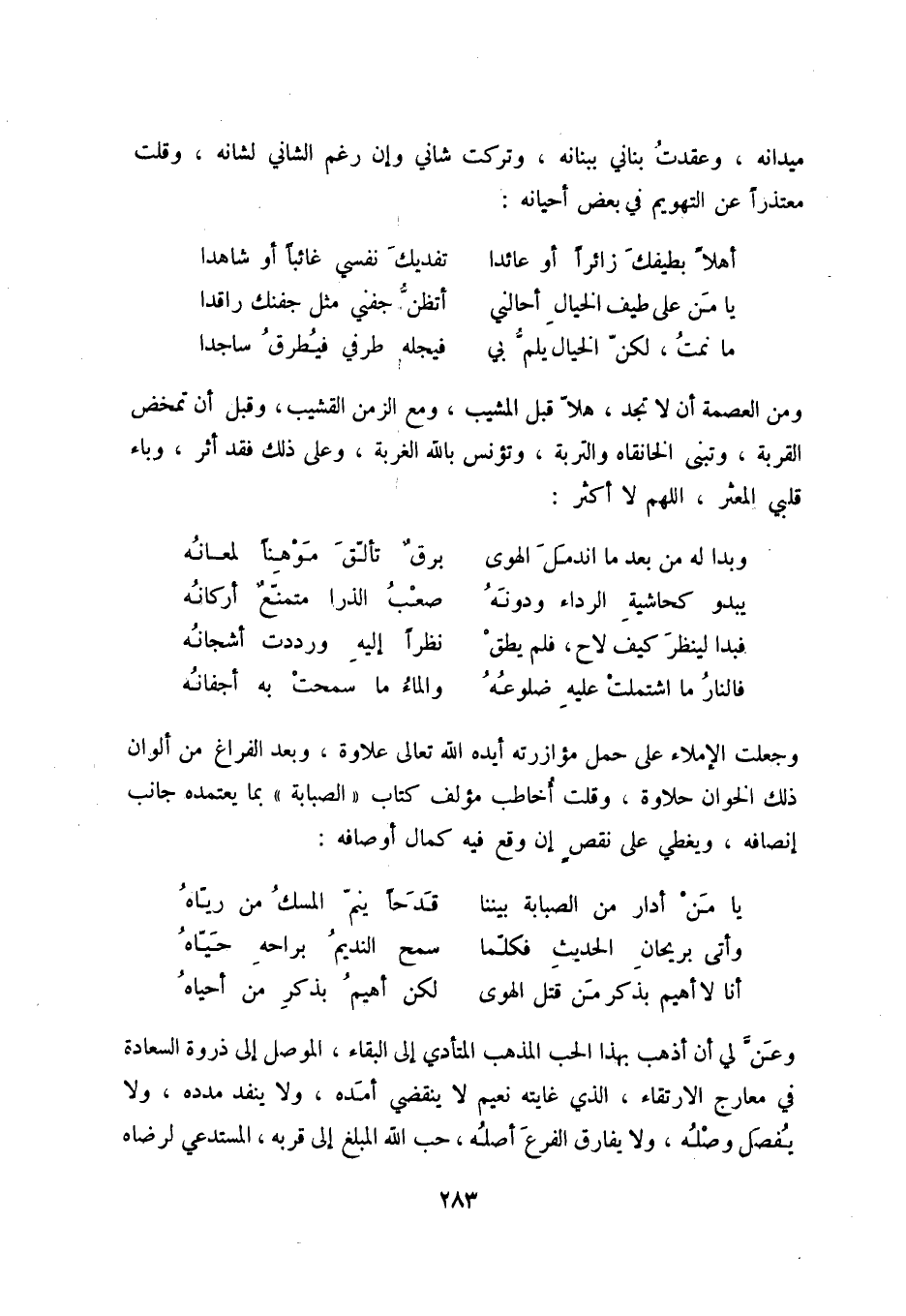 أنا لأهيم بذكر من قتل الهوى ... لكن أهيم بذكر من أحياه وعن لي أن أذهب بهذا الحب المذهب المتأدي إلى البقاء، الموصل إلى ذروة السعادة في معارج الارتقاء، الذي غايته نعيم لا نيقضي أمده، ولا ينفذ مدده، ولا يفصل وصله، ولا يفارق الفرع أصله، حب الله المبلغ إلى قربه، المستدعي لرضاه