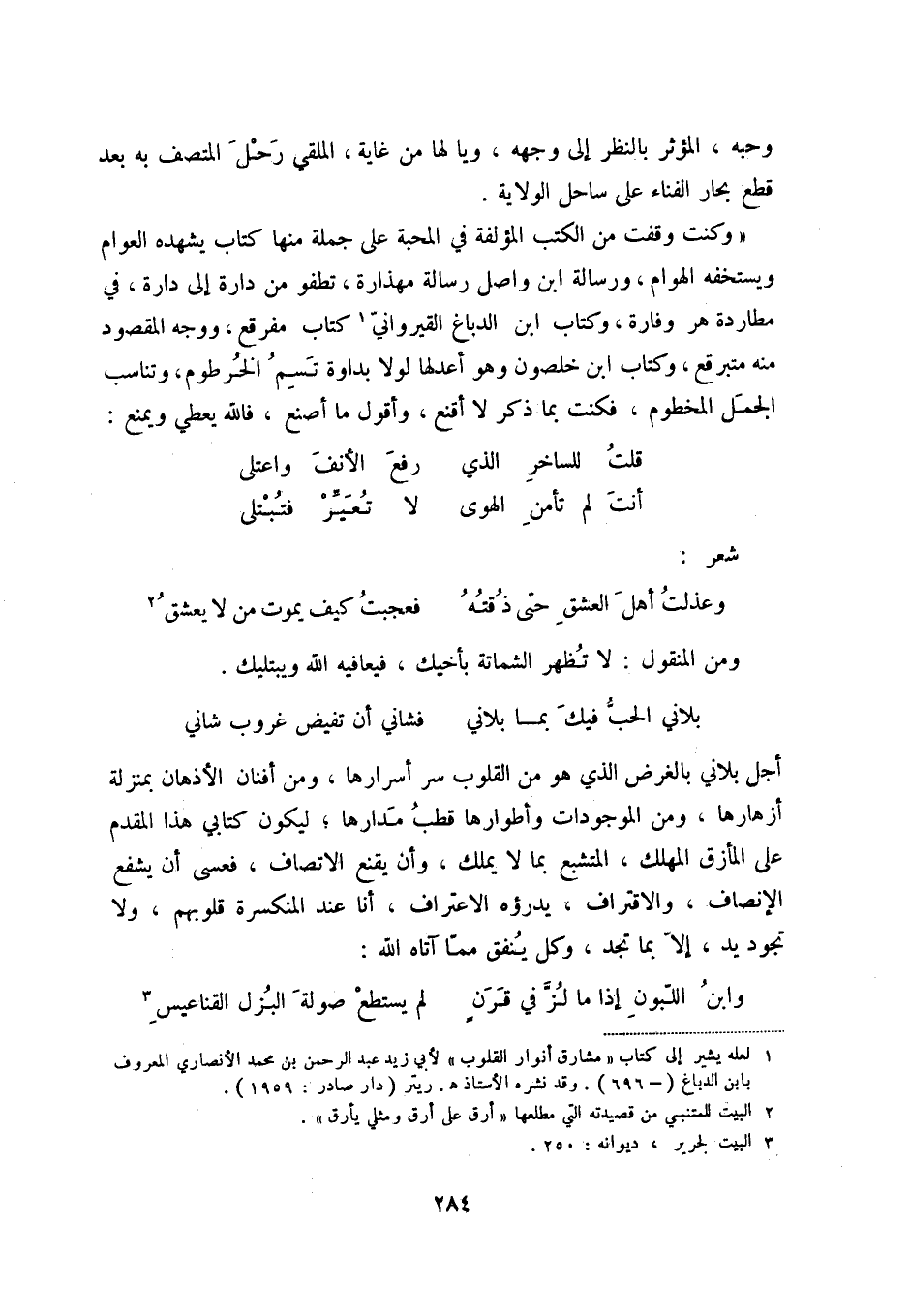 وكنت وقفت من الكتب المؤلفة في المحبة على جملة منها كتاب يشهده العوام ويستخفه الهوام، ورسالة ابن واصل رسالة مهذارة، تطفومن دارة إلى دارة، في مطاردة هر وفارة، وكتاب ابن الدباغ القيرواني (1) كتاب مفرقع، ووجه المقصود منه متبرقع، وكتاب ابن خلصون وهوأعدلها لولا بداوة تسم الخرطوم، وناسب الجمل المخطوم، فكنت بما ذكر لا أقنع، وأقول ما أصنع، فالله يعطي ويمنع: