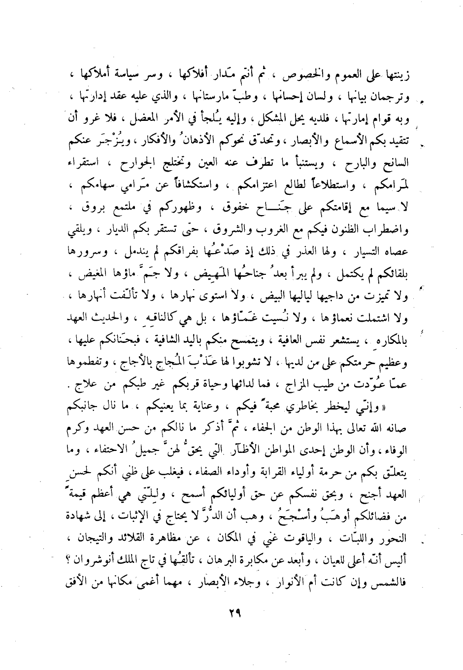 " وإني ليخطر بخاطري محبة فيكم وعناية بما يعنيكم ما نال جانبكم صانه الله تعالى بهذا الوطن من الجفاء ثم أذكر ما نالكم من حسن العهد وكرم الوفاء وأن الوطن إحدى المواطن الأظآر التي يحق لهن جميل الاحتفاء وما يتعلق بكم من حرمة أولياء القرابة وأوداء الصفاء فيغلب على ظني أنكم لحسن العهد أجنح وبحق نفسكم عن حق أوليائكم أسمح وللتي هي أعظم قيمةً من فضائلكم أوهب وأسجح وهب أن الدر لا يحتاج في الإثبات إلى شهادة النحور واللبات والياقوت غني في المكان عن مظاهرة القلائد والتيجان أليس أنه أعلى للعيان وأبعد عن مكابرة البرهان تألقها في تاج الملك أنوشروان فالشمس وإن كانت أم الأنوار وجلاء الأبصار مهما أغما مكانها من الأفق