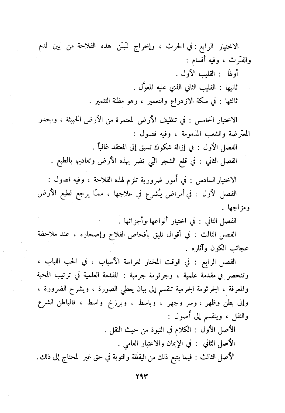 الاختيار السادس: في أمور ضرورية تلزم لهذه الفلاحة، وفيه فصول: