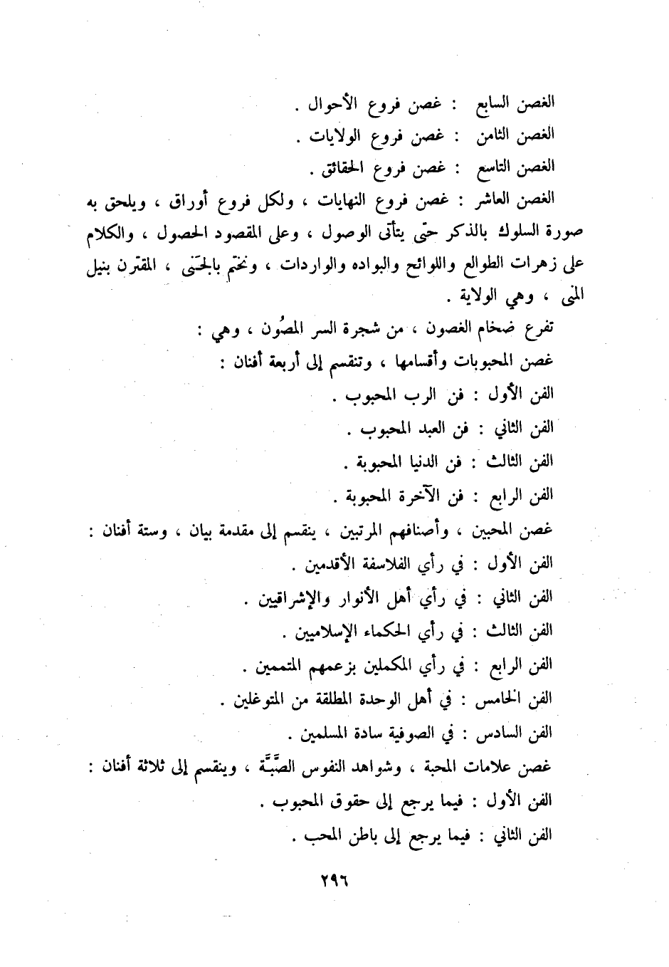 غصن علامات المحبة، وشواهد النفوس الصبة، وينقسم إلى ثلاثة أفنان: