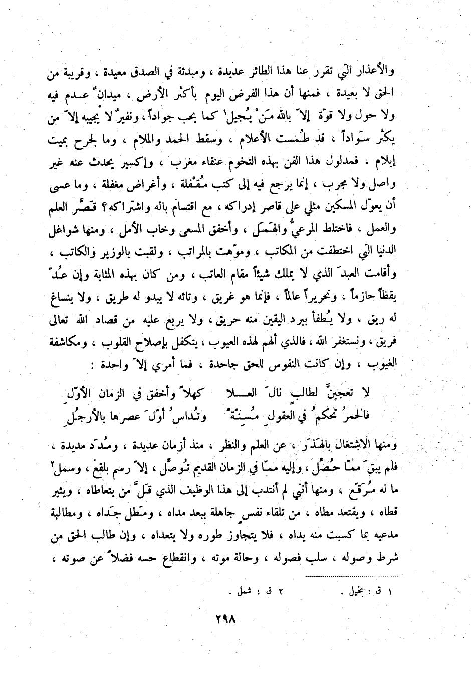 فالخمر تحكم في العقول مسنة ... وتداس أول عصرها بالأرجل ومنها الاشتغال بالهذر، عن اعلم والنظر، منذ أزمان عديدة، ومدد مديدة، فلم يبق مما حصل، وإليه مما في الزمان الديم توصل، إلا رسم بلقع، وسمل (2) ما له مرقع، ومنها أنني لم أنتدب إلى هذا الوظيف الذي قل من يتعاطاه، ويثير قطاه، ويقتعد مطاه، من تلقاء نفس جاهلة ببعد مداه، ومطل جداه، ومطالبة مدعيه بما كسبت منه يداه، فلا يتجاوز طوره ولا يتعداه، وإن طالب الحق من شرط وصوله، سلب فصوله، وحالة موته، وانقطاع حسنه فضلاً عن صوته،