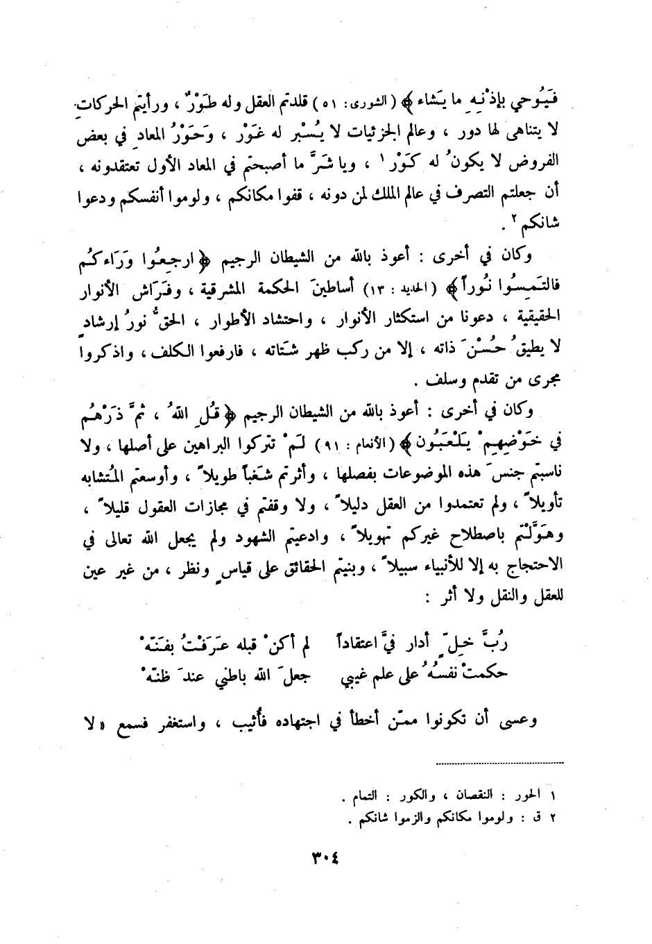 فيوحي بإذنه ما يشاء} (الشورى: 51) قلدتم العقل وله طور، ورأيتم الحركات لا يتناهى لها دور، وعالم الجزئيات لا يسبر له غور، وحور المعاد في بعض الفروض لا يكون له كور (1) ، ويا شر ما أصبحتم في المعاد الأول تعتقدونه، أن جعلتم التصرف في عالم الملك لمن دونه، قفوا مكانكم، ولوموا أنفسكم ودعوا شأنكم (2) .