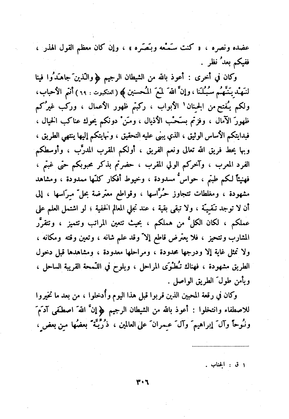 وكان في أخرى: أعوذ بالله من الشيطان الرجيم " والذين جاهدوا فينا لنهدينهم سبلنا، وإن الله لمع المحسنين " العنكبوت: 69 أنتم الأحباب، ولكم يفتح من الجنان (1) الأبواب، ركبتم ظهور الأعمال، وركب غيركم ظهور الآمال، وفزتم بسحب الأذيال، ومن دونكم يحوك عناكب الخيال، فبدايتكم الأساس الوثيق، الذي يبنى عليه التحقيق، ونهايتكم إليها ينتهي الطريق، وبها يحط فريق الله تعالى ونعم الفريق، أولكم المقرب المدرب، وأوسطكم الفرد المعرب، وآخركم الولي المقرب، حضرتم بذكر محبوبكم حتى غبتم، فهينئاً لكم طبتم، حواس مسدودة، وخيوط أفكار كلها ممدودة، ومشاهد مشهودة، ومغلطات تتجاوز حراسها، وقواطع معترضة بحل مراسها، إلى أن لا توجد تقية، ولا تبقى بقية، عند تجلي المعالم الخفية، لواشتمل العلم على عملكم، لكان الكل من هملكم، بحيث تتعين المراتب وتتميز، وتتقرر المشارب وتتحيز، لا يعترض قاطع إلا وقد علم شأنه، وتعين وقته ومكانه، ولا تمثل غاية إلا ودرجها محدودة، ومراحلها معدودة، ومشاهدها قبل دخول الطريق مشهودة، فهناك تطوى المراحل، ويلوح في اللمحة القريبة الساحل، ويأمن طول الطريق الواصل.