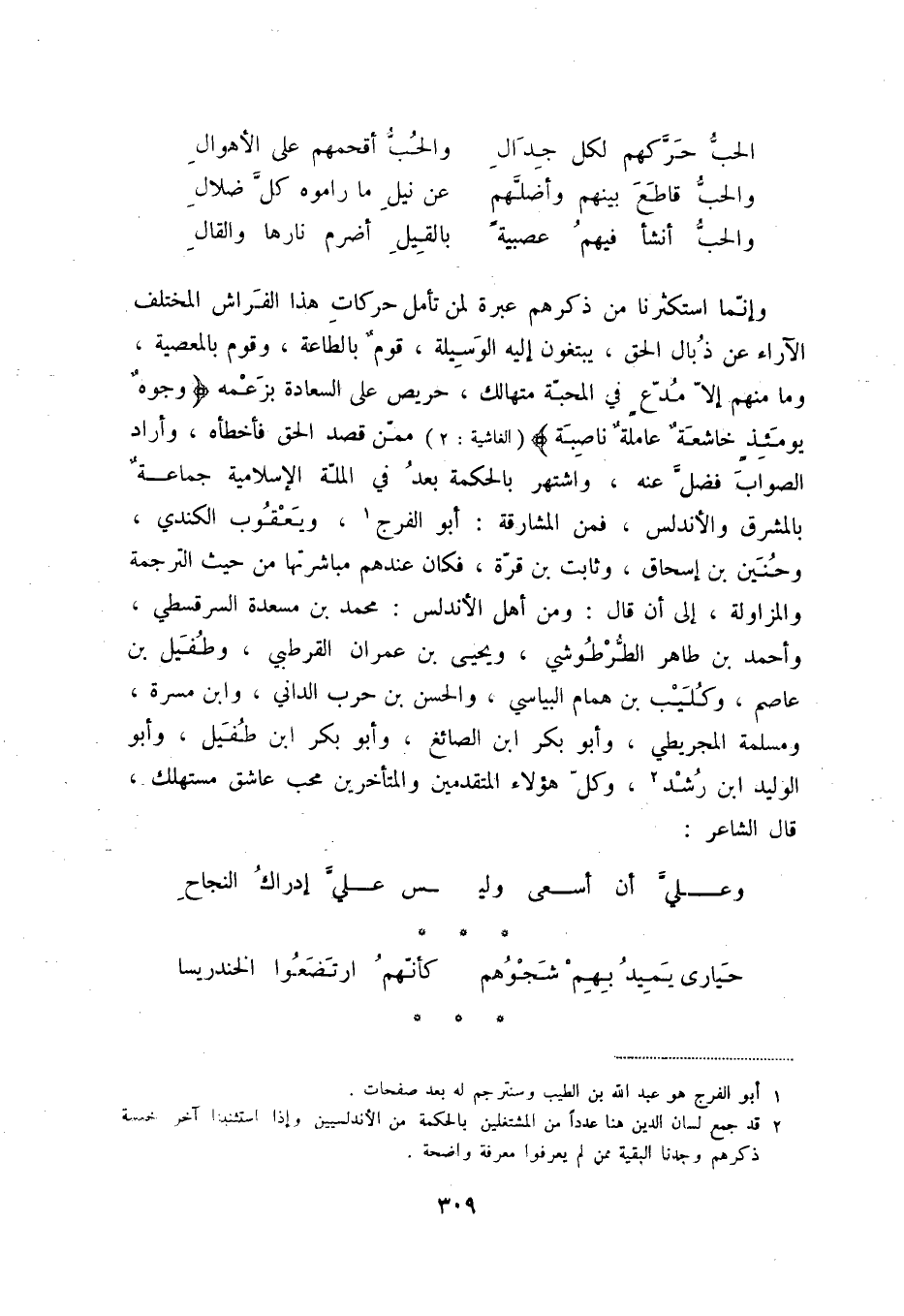 والحب أنشأ فيهم عصبية ... بالقيل أضرم نارها والقال وإنما استكثرنا من ذكرهم عبرة لمن تأمل حركات هذا الفراش المختلف الآراء عن ذبال الحق، يبتغون إليه الوسيلة، قوم بالطاعة، وقوم بالمعصية، وما منهم إلا مدع في المحبة متهالك، حريص على السعادة بزعمه " وجوه يومئذ خاشعة عاملة ناصبة " الغاشية:2 ممن قصد الحق فأخطأه، وأراد الصواب فضل عنه، واشتهر بالحكمة بعد في الملة الإسلامية جماعة بالمشرق والأندلس، فمن المشارقة: أبوالفرج (1) ، ويعقوب الكندي، وحنين بن إسحاق، وثابت بن قرة، فكان عندهم مباشرتها من حيث الترجمة والمزاولة، إلى أ، قال: ومن أهل الأندلس: محمد بن مسعدة السرقسطي، وأحمد بن طاهر الطرطوشي، ويحيى بن عمران القرطبي، وطفيل بن عاصم، وكليب بن همام البياسي، والحسن بن حرب الداني، وابن مسرة، ومسلمة المجريطي، وأبوبكر ابن الصائغ، وأوبكر ابن طفيل، وأبوالوليد ابن رشد (2) ، وكل هؤلاء المتقدمين والمتأخرين محب عاشق مستهلك، قال الشاعر: