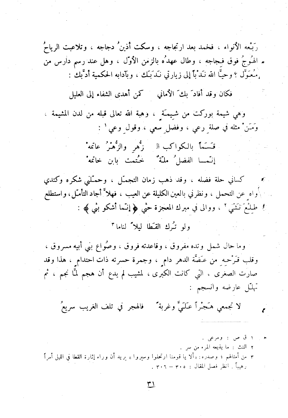 ربعه الأنواء فخمد بعد ارتجاجه وسكت أذين دجاجه وتلاعبت الرياح الهوج فوق فجاجه وطال عهده بالزمن الأول وهل عند رسم دارس من معول وحيا الله ندباً إلى زيارتي ندبك وبآدابه الحكيمة أدبك: