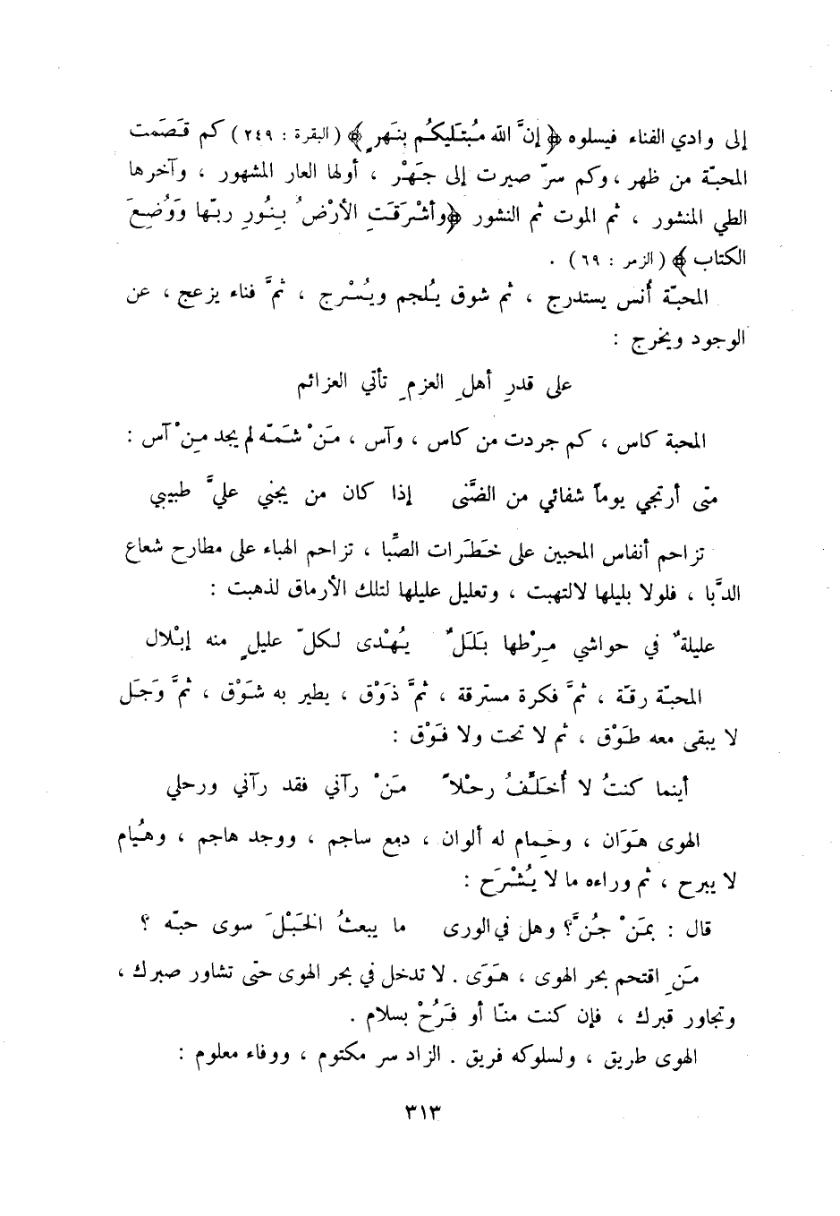 إلى وادي الفناء فيسلوه " إن الله مبتليكم بنهر " البقرة: 149 كم قمصت المحبة من ظهر، وكم سر صيرت إلى جهر، أولها العار المشهور، وآخرها الطي المنشور، ثم الموت ثم النشور {وأشرقت الأرض بنور ربها ووضع الكتاب} (الزمر: 69) .