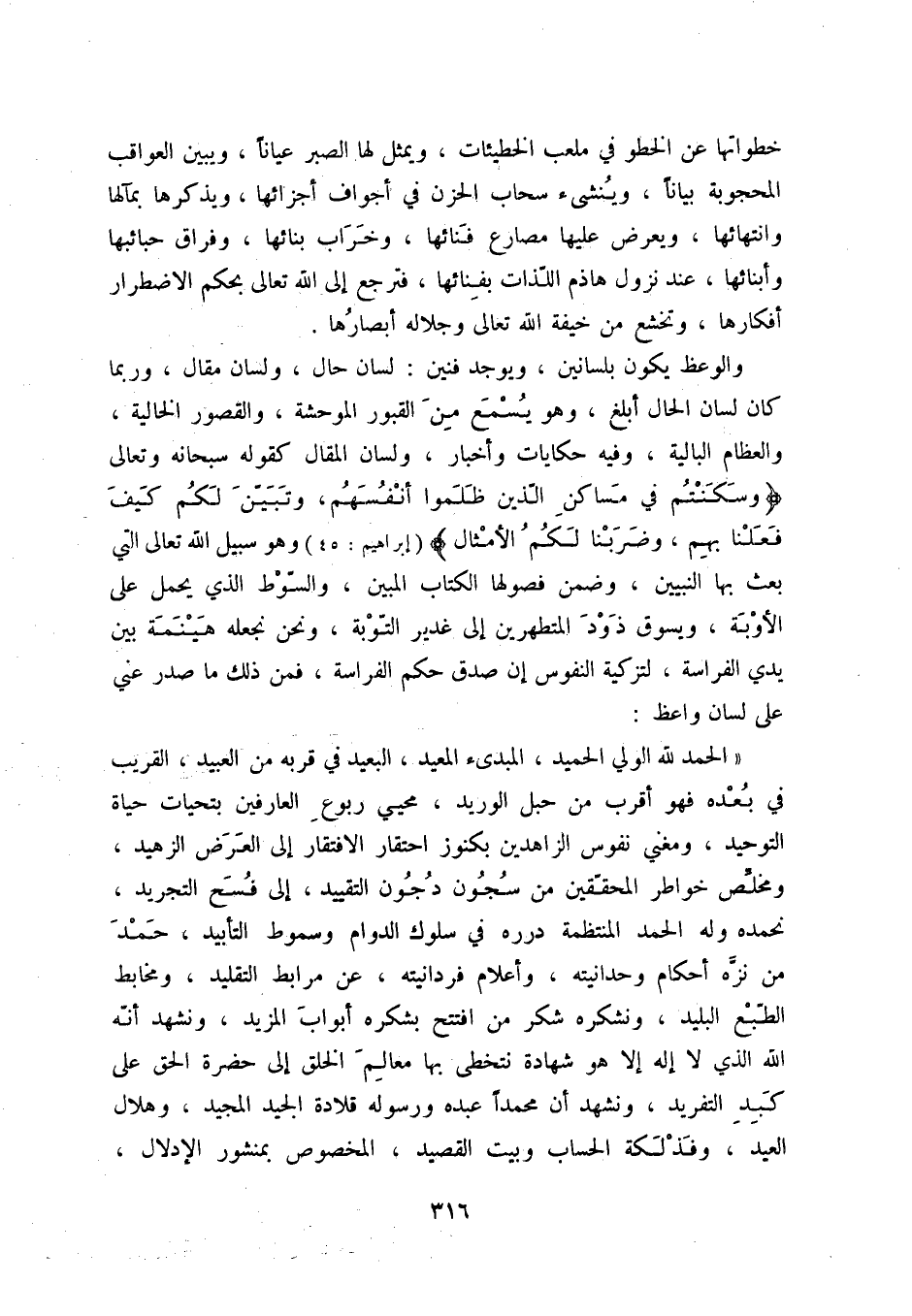 والوعظ يكون بلسانين، ويوجد فنين: لسان حال، ولسان مقال، وربما كان لسان الحال أبلغ، وهويسمع من القبور الموحشة، والقصور الخالية، والعظام البالية، وفيه حكايات وأخبار، ولسان المقال كقوله سبحانه وتعالى " وسكنتم في مساكن الذين ظلموا أنفسهم، وتبين لكم كيف فعلنا بهم، وضربنا لكم الأمثال " إبراهيم " 45 وهوسبيل الله تعالى التي بعث بها النبيين، وضمن فصولها الكتاب المبين، والسوط الذي يحمل على الأوبة، ويسوق ذود المتطهرين إلى غدير التوبة، ونحن نجعله هيمنة بين يدي الفراسة، لتزكيه النفوس إن صدق حكم الفراسة، فمن ذلك ما صدر عني على لسان واعظ: