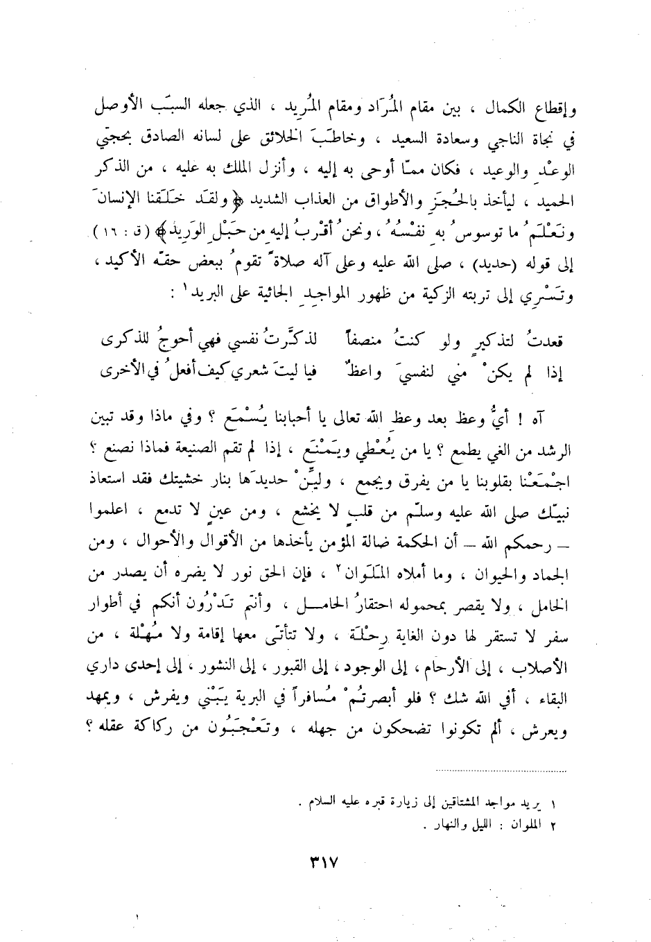 وإقطاع الكمال، بين مقام المراد ومقام المريد، الذي جعله السبب الأوصل في نجاة الناجي، وسعادة السعيد، وخاطب الخلائق على لسانه الصادق بحجتي الوعد والوعيد، فكان مما أوحى به إليه، وأنزل الملك به عليه، من الذكر الحميد، ليأخذ بالحجز والأطواق من العذاب الشديد " ولقد خلقنا الإنسان ونعلم ما توسوس به نفسه، ونحن أقرب إليه من حبل الوريد " ق:16.