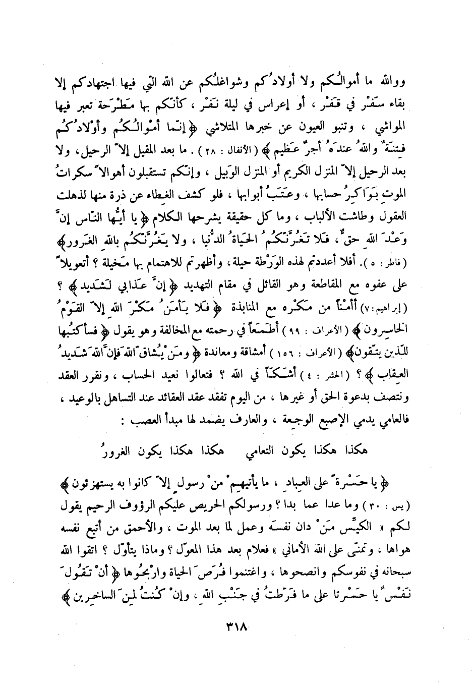 ووالله ما أموالكم ولا أولادكم وشواغلكم عن الله التي فيها اجتهاد إلا بقاء سفر في قفر، أوإعراس في ليلة نفر، كأنكم بها مطرحة تعبر فيها المواشي، وتنبوالعيون عن خبرها المتلاشي " إنما أموالكم وأولادكم فتنة والله عنده أجر عظيم " الأنفال:28. ما بعد المقيل إلا الرحيل ولا بعد الرحيل إلا المنزل الكريم أوالمنزل الوبيل، وإنكم تستقبلون أهوالاً سكرات الموت بواكر حسابها، وعتب أبوابها، فلوكشف الغطاء عن ذرة منها لذهلت العقول وطاشت الألباب، وما كل حقيقة يشرحها الكلام " يا أيها الناس إن وعد الله حق، فلا تغرنكم الحياة الدنيا، ولا يغرنكم بالله الغرور " فاطر:5.