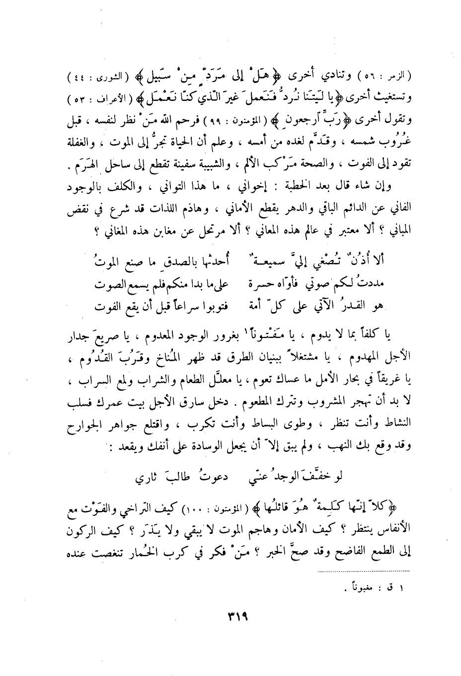الزمر:56 وتنادي أخرى " هل إلى مرد من سبيل " الشورى: 44 وتستغيث أخرى " يا ليتنا نرد فنعمل غير الذي كنا نعمل " الأعراف:53 وتقول أخرى " رب ارجعون " المؤمنون:99 فرحم الله من نظر لنفسه، قبل غروب شمسه، وقدم لغده من أمسه، وعلم أ، الحياة تجر إلى الموت، والغفلة تقود إلى الفوت، والصحة مركب الألم، والشبيبة سفينة تقطع إلى ساحل الهرم.