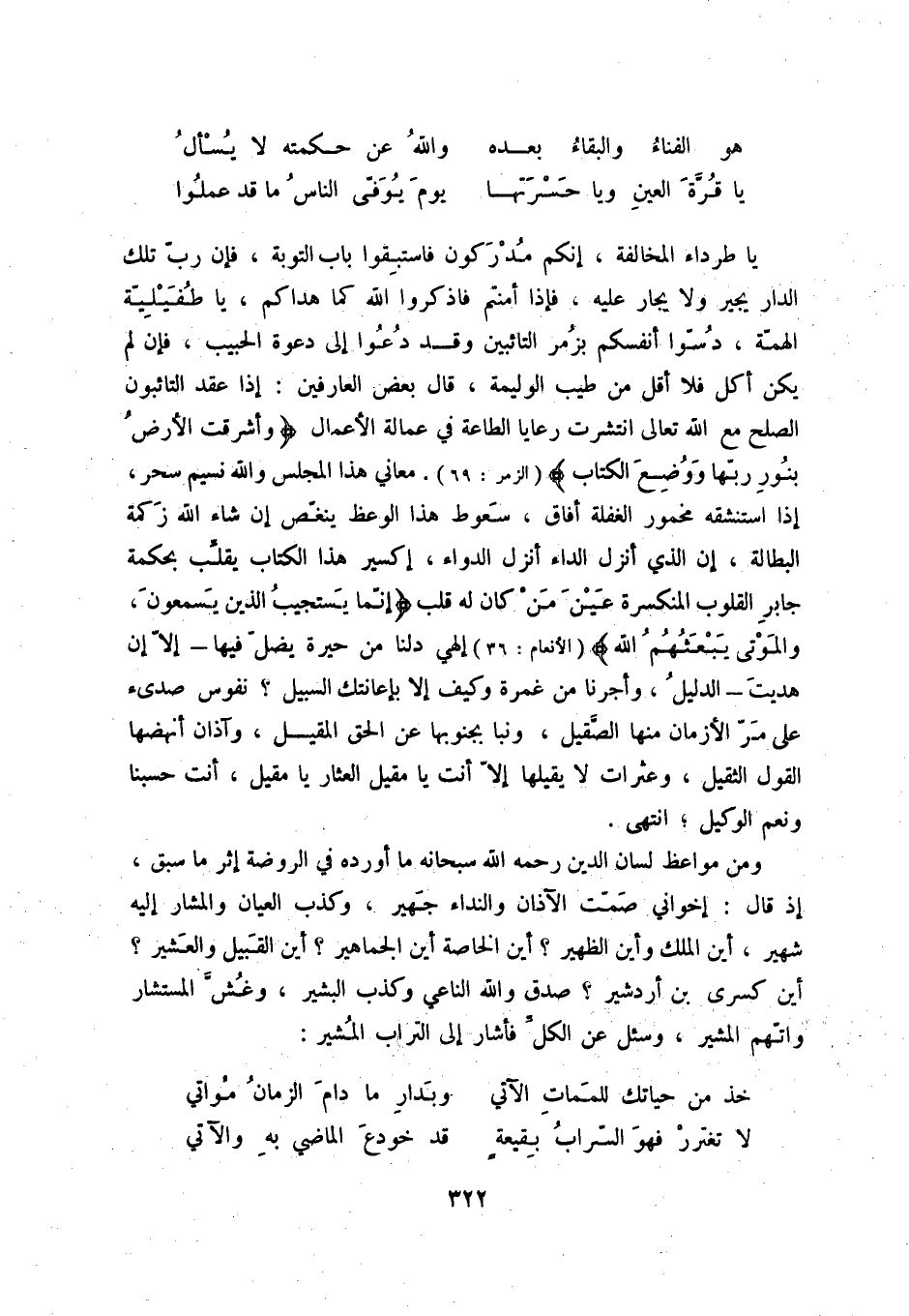 يا قرة العين ويا حسرتها ... يوم يوفى الناس ما قد عملوا يا طرداء المخالفة، إنكم مدركون فاستبقوا باب التوبة، فإن رب تلك الدار يجير ولا يجار عليه، فإذا أمنتم فاذكروا الله كما هداكم، يا طفيلية الهمة، دسوا أنفسكم بزمر التائبين وقد دعوا إلى دعوة الحبيب، فإن لم يكن أكل فلا أقل من طيب الوليمة، قال بعض العارفين: إذا عقد التائبون الصلح مع الله تعالى انتشرت رعايا الطاعة في عمالة الأعمال " وأشرقت الأرض بنور ربها ووضع الكتاب " الزمر:69. معاني هذا المجلس والله نسيم سحر، إذا استنشقه مخمور الغفلة أفاق، سعوط هذا الوعظ ينغص إن شاء الله زكمة البطالة، إن الذي أنزل الداء أنزل الدواء، إكسير هذا الكتاب يقلب بحكمة جابر القلوب المنكسرة عين من كان له قلب " إنما يستجيب الذين يسمعون، والموتى يبعثهم الله " الأنعام:36 إلهي دلنا من حيرة يضل فيها - إلا إن هديت - الدليل، وأجرنا من غمرة وكيف إلا بإعانتك السبيل نفوس صدئ على مر الأزمان منها الصقيل، ونبا بجنوبها عن الحق المقيل، وآذان أنهضها القول الثقيل، وعثرات لا يقيلها إلا أنت يا مقيل العثار يا مقيل، أنت حسبنا ونعم الوكيل؛ انتهى.