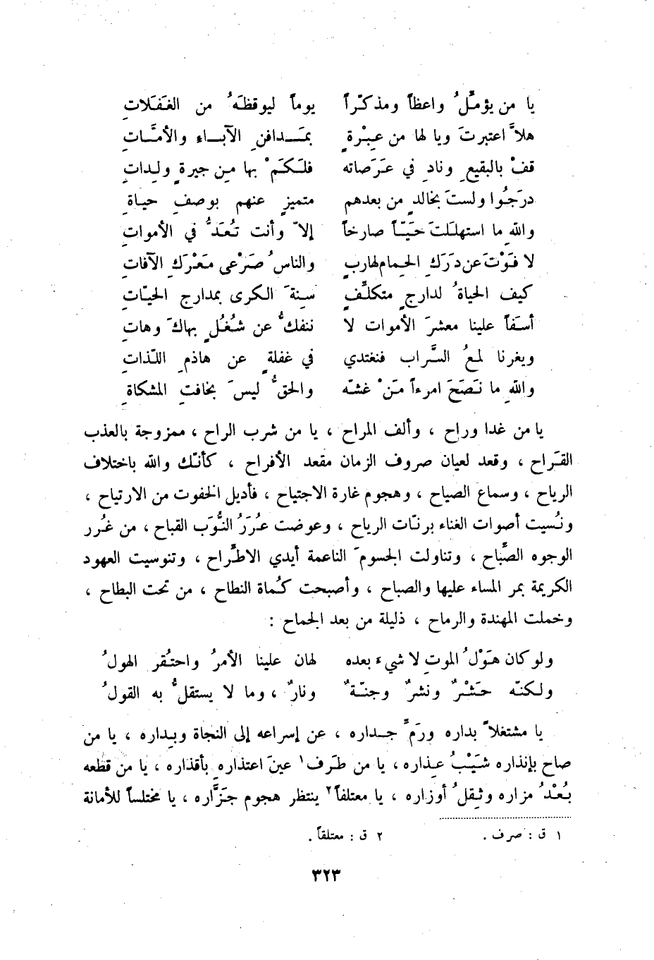 ولكنه حشر ونشر وجنة ... ونار، وما لا يستقل به القول يا مشتغلاً بداره ورم جداره، عن إسراعه إلى النجاة وبداره، يا من صاح بإنذاره شيب عذاره، يا من طرف (1) عين اعتذاره بأقذاره، يا من قطعه بعد مزاره وثقل أوزاره، يا معتلفاً (2) ينتظر هجوم جزاره، يا مختلساً للأمانة
