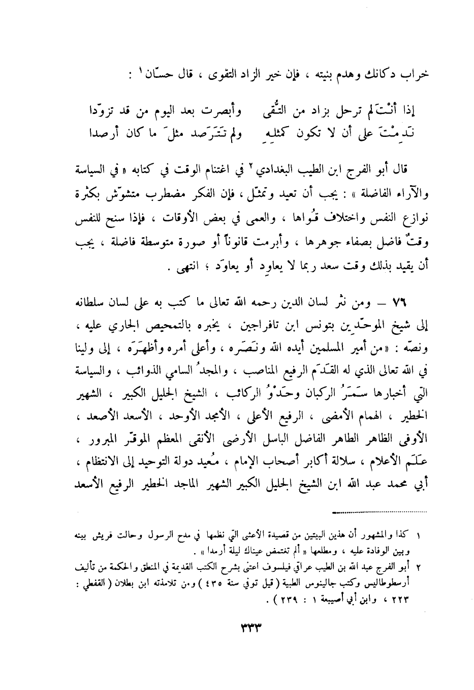 ندمت على أن لا تكون كمثله ... ولم تترصد مثل ما كان أرصدا قال أبوالفرج ابن الطيب البغدادي (2) في اغتنام الوقت في كتابه في السياسة والآراء الفاضلة: يجب أن تعيد وتمثل، فإن الفكر مضطرب متشوش بكثرة نوازع النفس واختلاف قواها، والعمى في بعض الأوقات، فإذا سنح لنفس وقت فاضل بصفاء جوهرها، وأبرمت قانوناً أوصورة متوسطة فاضلة، يجب أ، يقيد بذلك وقت سعد ربما لا يعاود أويعاود؛ انتهى.