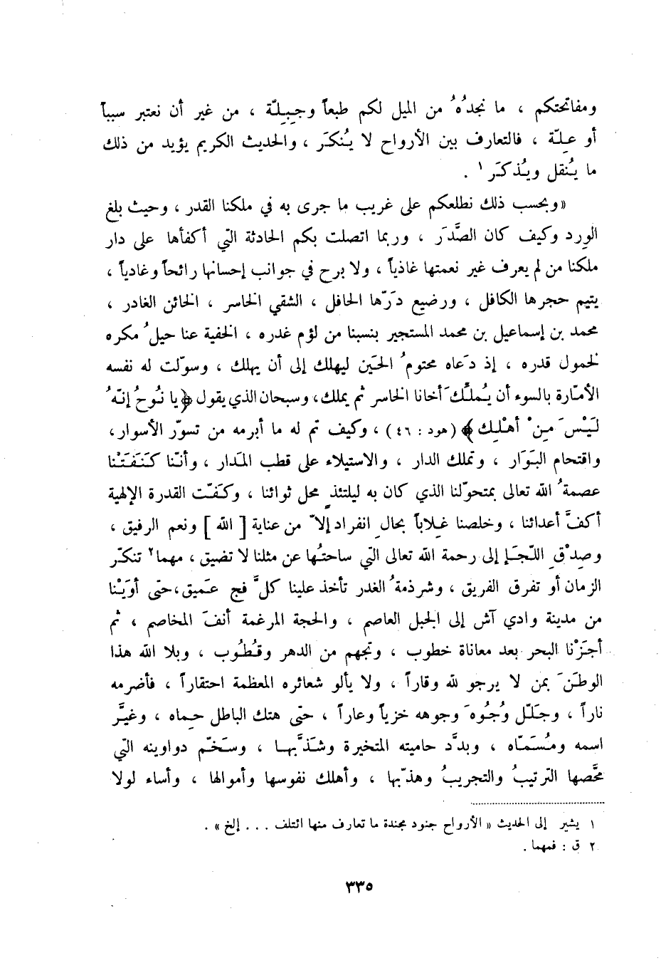 وبحسب ذلك نطلعكم على غري ما جرى به في ملكنا القدر، وحيث بلغ الورد وكيف كان الصدر، وربما اتصلت بكم الحادثة التي أكفأها على دار ملكنا من لم يعرف غير نعمتها غاذياً، ولا برح في جوانب إحسانها رائحاً وغادياً، يتيم حجرها الكافل، ورضيع درها الحافل، الشقي الخاسر، الخائن الغادر، محمد بن إسماعيل بن محمد المستجير بنسبنا من لؤم غدره، الخفية عنا حيل مكره لخمول قدره، إذ دعاه محتوم الحين ليهلك إلى أن يهلك، وسولت له نفسه الأمارة بالسوء أن يملك أخانا الخاسر ثم يملك، وسبحان الذي يقول: يا نوح إنه ليس من أهلك " هود:46، وكيف تم له ما أبرمه من تسور الأسوار، واقتحام البوار، وتملك الدار، والاستيلاء على قطب المدار، وأننا كنفتنا عصمة الله تعالى بمتحولنا الذي كان به ليلتئذ محل ثوائنا، وكفت القدرة الإلهية أكف أعدائنا، وخلصنا غلاباً بحال انفراد إلا من عناية [الله] ونعم الرفيق، وصدق اللجإ إلى رحمة الله تعالى التي ساحتها عن مثلنا لا تضيق، مهما (2) تنكر الزمان أوتفرق الفريق، وشرذمة الغدر تأخذ علينا كل فج عميق، حتى أوينا من مدينة وادي آش إلى الجبل العاصم، والحجة المرغمة أنف المخاصم، ثم أجزنا البحر بعد معاناة خطوب، وتجهم من الدهر وقطوب، وبلا الله هذا الوطن بمن لا يرجوله وقاراً، ولا يألوشعائره المعظمة احتقاراً، فأضرمه ناراً، وجلل وجوه وجوهه خزياً وعاراً، حتى هتك الباطل حماه، وغير اسمه ومسماه، وبدد حاميته المتخيرة وشذبها، وسخم دواوينه التي محصها الترتيب والتجريب وهذبها، وأهلك نفوسها وأموالها، وأساء لولا