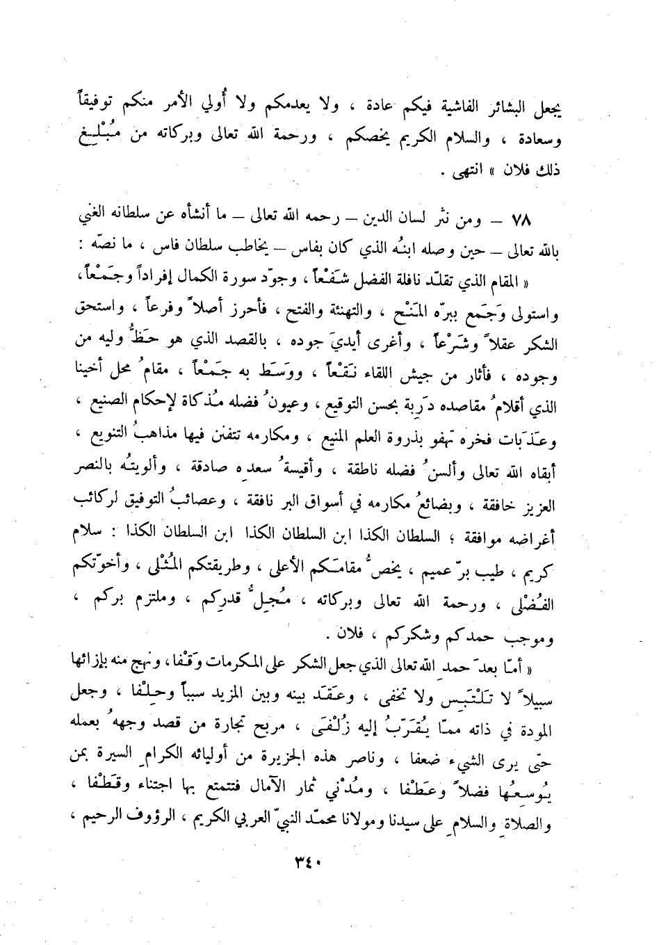 78 - ومن نثر لسان الدين - رحمه الله تعالى - ما أنشأه عن سلطانه الغني بالله تعالى - حين وصله ابنه الذي كان بفاس - يخاطب سلطان فاس، ما نصه: المقام الذي تقلد نافلة الفضل شفعاً، وجود سورة الكمال إفراداً وجمعاً، واستولى وجمع ببره المنح، والتهنئة والفتح، فأحرز أصلاً وفرعاً، واستحق الشكر عقلاً وشرعاً، وأغرى أيدي جوده، بالقصد الذي هوحظ وليه من وجوده، فأثار من جيش إلقاء نقعاً، ووسط به جمعاً، مقام محل أخينا الذي أقلام مقاصده دربة بحسن التوقيع، وعيون فضله مذكاة لإحكام الصنيع، وعذبات فخره تهفوبذروة العلم المنيع، ومكارمه تتفنن فيها مذاهب التنويع، أبقاه الله تعالى وألسن فضله ناطقة، وأقيسة سعده صادقة، وألويته بالنصر العزيز خافقة، وبضائع مكارمه في أسواق البر نافقة، وعصائب التوفيق لركائب أغراضه موافقة؛ السلطان الكذا ابن السلطان الكذا ابن السلطان الكذا: سلام كريم، طيب بر عميم، يخص مقامكم الأعلى، وطريقتكم المثلى، وأخوتكم الفضلى، ورحمة الله تعالى وبركاته، مجل قدركم، وملتزم بركم، وموجب حمدكم وشكركم، فلان.