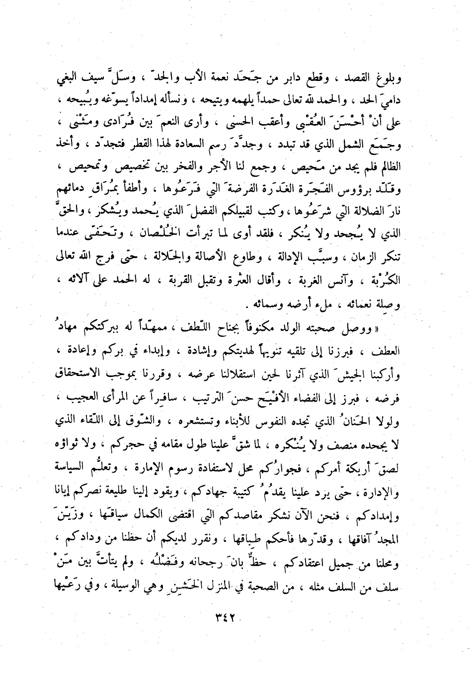 ووصل صحبته الولد مكنوفاً بجناح الطف، ممهداً له ببركتكم مهاد العطف، فبرزنا إلى تلقية تنويهاً لهديتكم وإشادة، وإبداء في بركم وإعادة، وأركبنا الجيش الذي آثرنا لحين استقلالنا عرضه، وقررنا بموجب الاستحقاق فرضه، فبرز إلى الفضاء الأفيح حسن الترتيب، سافراً عن المرأى العجيب، ولولا الحنان الذي تجده النفوس للأبناء وتستشعره، والشوق إلى اللقاء الذي لا يجحده منصف ولا ينكره، لما شق علينا طول مقامه في حجركم، ولا ثواؤه لصق أريكة أمركم، فجواركم محل لاستفادة رسوم الإمارة، وتعلم السياسة والإدارة، حتى يرد علينا يقدم كتيبة جهادكم، ويقود إلينا طليعة نصركم إيانا وغمدادكم، فنحن الآن نشكر مقاصدكم التي اقتضى الكمال سياقها، وزين المجد آفاقها، وقدرها فأحكم طباقها، ونقرر لديكم أن حظنا من ودادكم، ومحلنا من جميل اعتقادكم، حظ بان رجحانه وفضله، ولم يتأت بين من سلف من السلف مثله، من الصحبة في المنزل الخشن وهي الوسيلة، وفي رعيها
