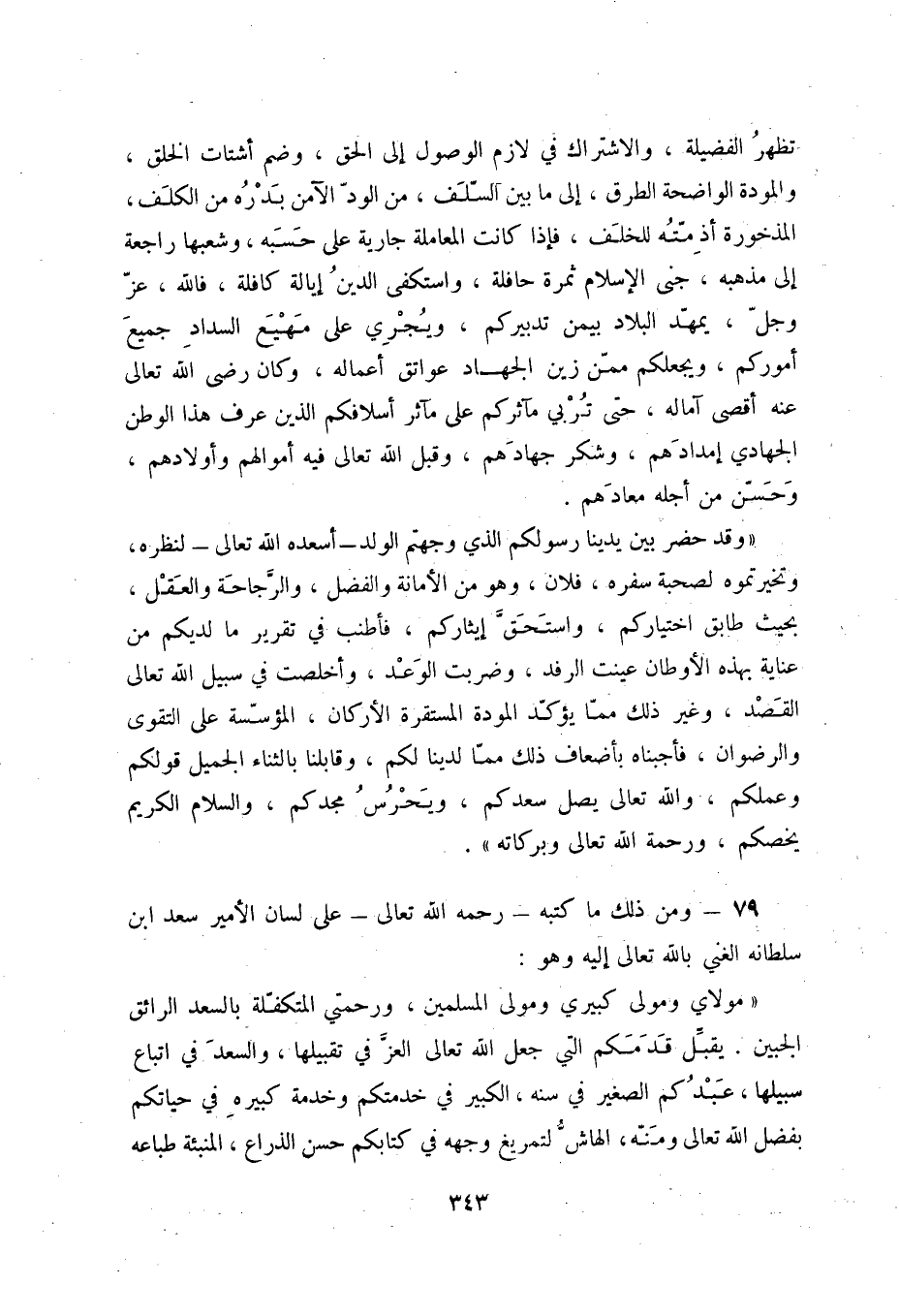 79 - ومن ذلك ما كتبه - رحمة الله تعالى - على لسان الأمير سعد ابن سلطانه الغني بالله تعالى إليه وهو: