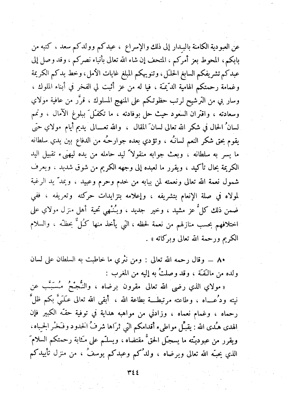 مولاي الذي رضى الله تعالى مقرون برضاه، والنجح مسبب عن نيته ودعاه، وطاعته مرتبطة بطاعة الله، أبقى الله تعالى علي بكم ظل رحماه، وغمام نعماه، وزادني من مواهبه هداية في توفية حقه الكبير فإن الهدى هدى الله: يقبل مواطئ أقدامكم التي ثراها شرف الخدود وفخر الجباه، ويقرر من عبوديته ما يسجل الحق مقتضاه، ويسلم على مثابة رحمتكم السلام الذي يحبه الله تعالى ويرضاه، ولدكم وعبدكم يوسف، من منزل تأييدكم