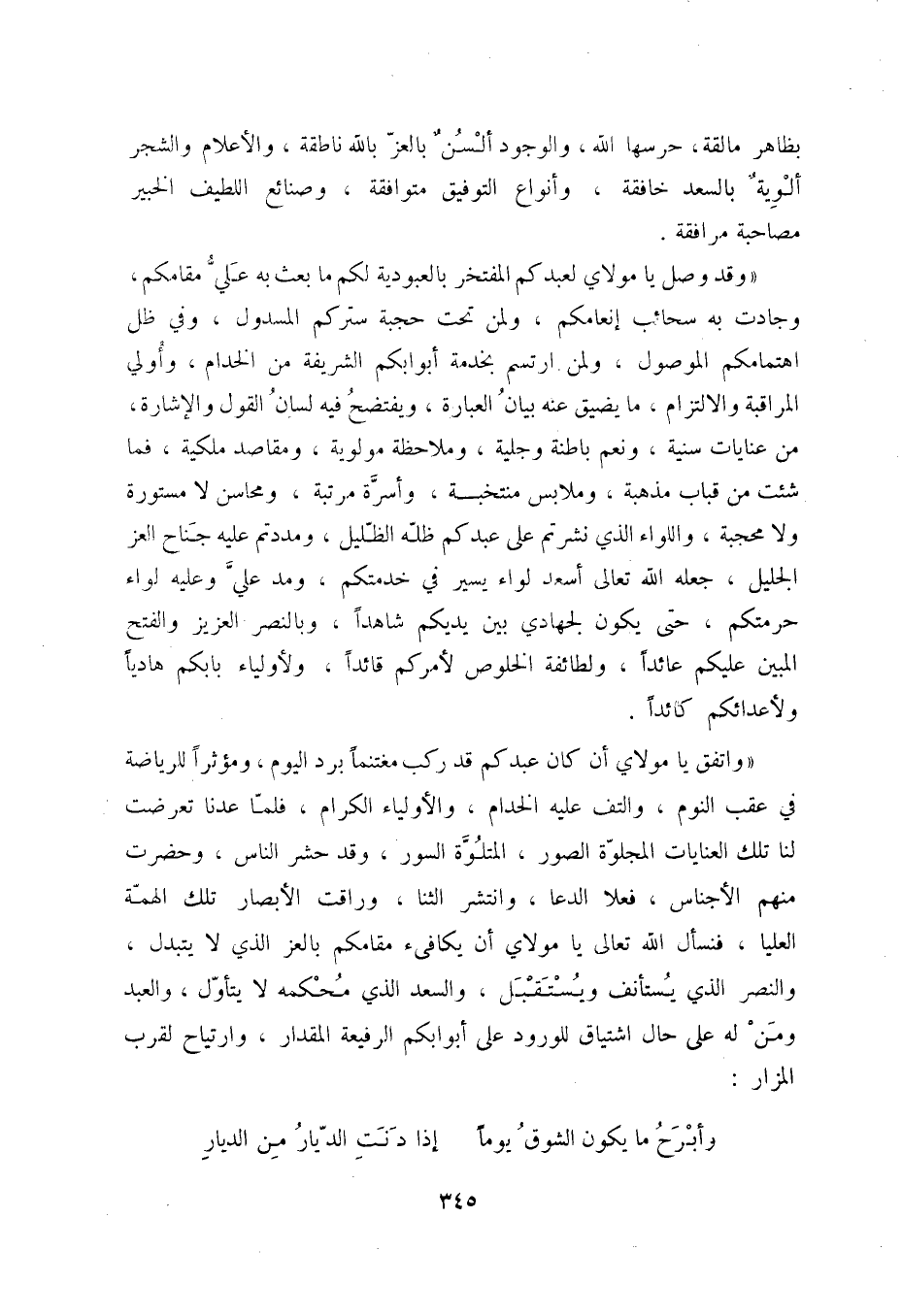 وقد وصل يا مولاي لعبدكم المفتخر بالعبودية لكم ما بعث به علي مقامكم، وجادت به سحائب إنعامكم، ولمن تحت حجبة ستركم المسدول، وفي ظل اهتمامكم الموصول، ولمن ارتسم بخدمة أبوابكم الشريفة من الخدام، وأولي المراقبة والالتزام، ما يضيق عنه بيان العبارة، ويفتضح فيه لسان القول والإشارة، من عنايات سنية، ونعم باطنة وجلية، وملاحظة مولوية، ومقاصد ملكية، فما شئت من قباب مذهبة، وملابس منتخبة، وأسرة مرتبة، ومحاسن لا مستورة ولا محجبة، واللواء الذي نشرتم على عبدكم ظله الظليل، ومددتم عليه جناح العز الجليل، جعله الله تعالى أسعد لواء في خدمتكم، ومد علي وعليه لواء حرمتكم، حتى يكون لجهادي بين يديكم شاهداً، وبالنصر العزيز والفتح المبين عليكم عائداً، ولطائفة الخلوص لأمركم قائداً، ولأولياء بابكم هادياً ولأعدائكم كائداً.