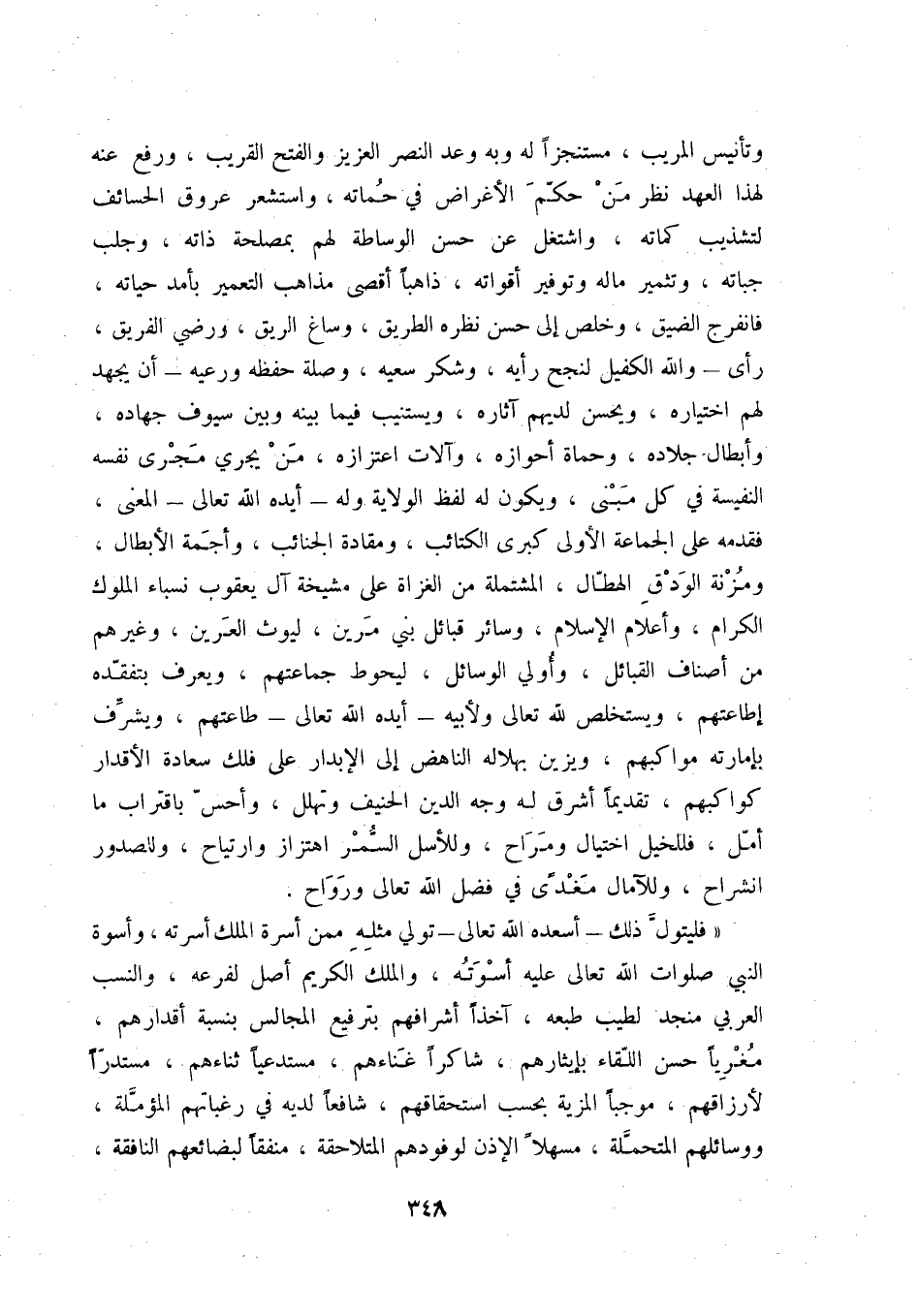 فليتول ذلك - أسعده الله تعالى - تولي مثله ممن أسرة الملك أسرته، وأسوة الني صلوات الله تعالى عليه أسوته، والملك الكريم أصل لفرعه، والنسب العربي منجد لطيب طبعه، آخذاً أشرافهم بترفيع المجالس بنسبة أقدارهم، مغرياً حسن اللقاء بإيثارهم، شاكراً غناءهم، مستدعياً ثناءهم، مستدراً لأرزاقهم، موجباً المزية بحسب استحقاقهم، شافعاً في رغباتهم المؤملة، ووسائلهم المتحملة، مسهلاً الإذن لوفودهم المتلاحقة، منفقاً لضائعهم النافقة