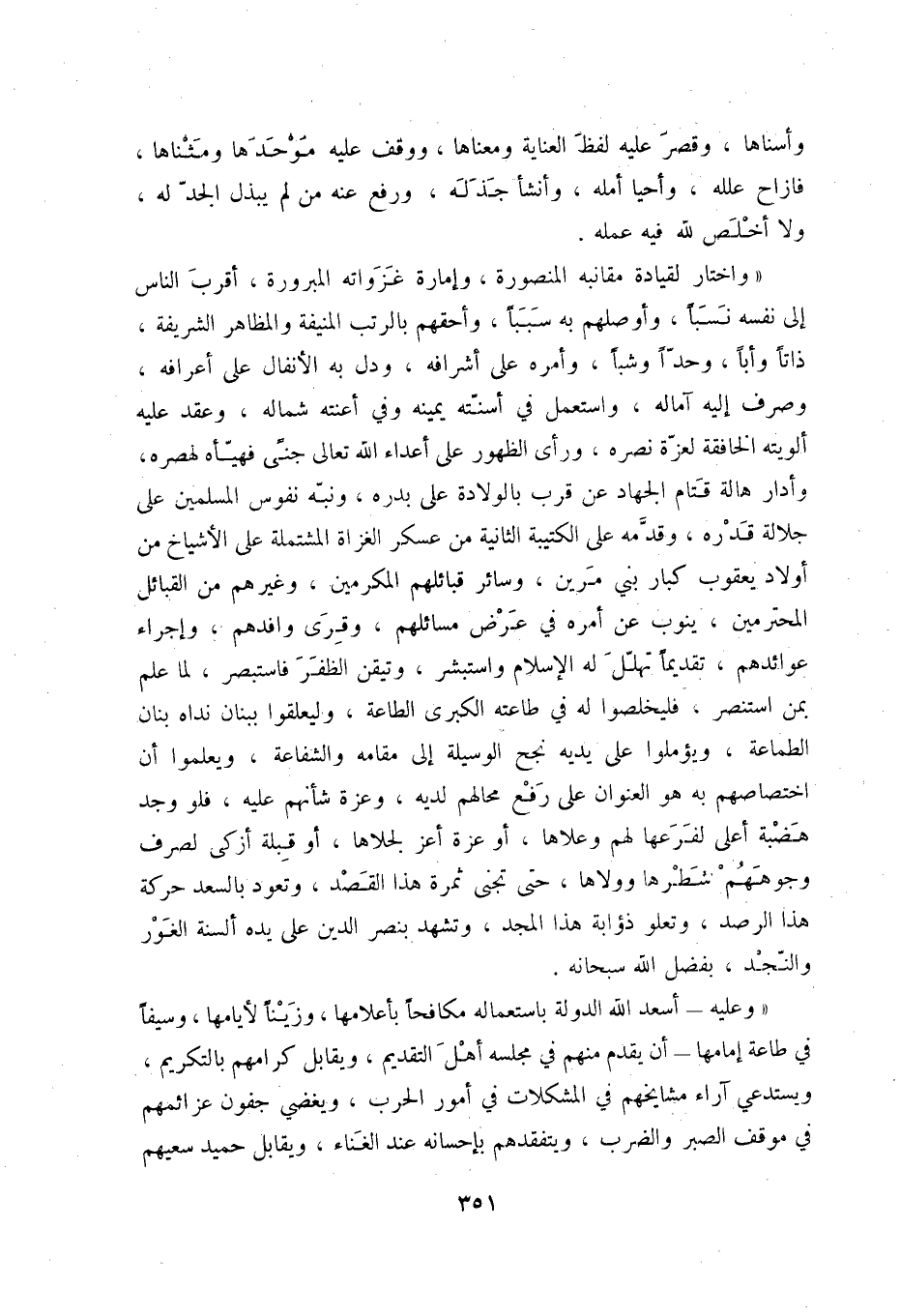 واختار لقيادة مقانبه المنصورة، وإمارة غزواته المبروروة، أقرب الناس إلى نفسه نسباً، وأوصلهم به سبباً، وأحقهم بالرتب المنيفة والمظاهر الشريفة، ذاتاً وأباً، وحداً وشباً، وأمره على أشرافه، ودل له الأنفال على أعرافه، وصرف إليه آماله، واستعمل في أسنته يمينه وفي أعنته شماله، وعقد عليه ألويته الخافقة لعزة نصره، ورأى الظهور على أعداء الله تعالى جنى فهيأه لهصره، وأدار هالة قتام إجهاد عن قرب بالولادة على بدره، ونبه نفوس المسلمين على جلاله قدره، وقدمه على الكتيبة الثانية من عسكر الغزاة المشتملة على الأشياخ من أولاد يعقوب كبار بني مرين، وسائر قبائلهم المكرمين، وغيرهم من القبائل المحترمين، ينوب عن أمره في عرض مسائلهم، وقرى وافدهم، وإجراء عوائدهم، تقديماً تهلل له الإسلام واستبشر، وتيقن الظفر فاستبصر، لما علم بمن استنصر، فليخلصوا له في طاعته الكبرى الطاعة، وليعلقوا ببنان نداه بنان الطماعة، ويؤملوا على يديه نجح الوسيلة إلى مقامه والشفاعة، ويعلموا أن اختصاصهم به هوالعنوان على رفع محالهم لديه، وعزة شأنهم عليه، فلووجد هضبة أعلى لفرعها لهم وعلاها، أوعزة أعز لجلاها، أوقبلة أزكى لصرف وجوههم وولاها، حتى تجنى ثمرة هذا القصد، وتعود بالسعد حركة هذا الرصد، وتعلوذؤابة هذا المجد، وتشهد بنصر الدين على يده ألسنة الغور والنجد، بفضل الله سبحانه.