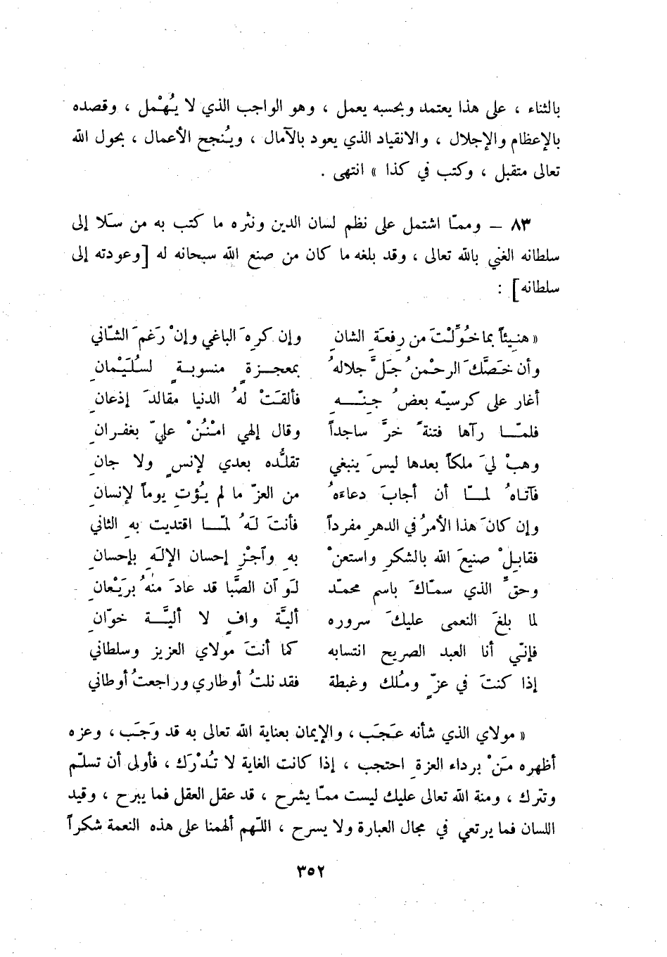 إذا كنت في يعز وملك وغبطة ... فقد نلت أوطاري وراجعت أوطاني مولاي الذي شأنه عجب، والإيمان بعناية الله تعالى به قد وجب، وعزه أظهره من برداء العزة احتجت، إذا كانت الغاية لا تدرك، فأولى أن تسلم وتترك، ومنة الله تعالى عليك ليست مما يشرح، قد عقل العقل فما يبرح، وقيد اللسان فما يرتعي في مجال العبارة ولا يسرح، اللهم ألهمنا على هذه النعمة شكراً