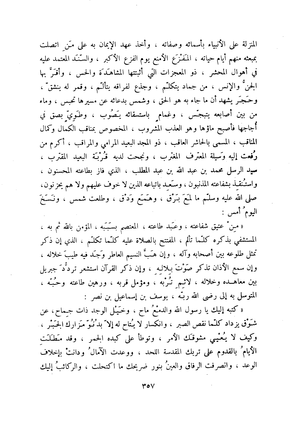 من عتيق شفاعته، وعبد طاعته، المعتصم بسببه، المؤمن بالله ثم به، المستشفي بذمره كلما تألم، المفتتح بالصلاة عليه كلما تكلم، الذي إن ذكر تمثل طلوعه بين أصحابه وآله، وإن هب النسيم العاطر وجد فيه طيب خلاله، وإن سمع الأذان تذكر صوت بلاله، وإن ذكر القرآن استشعر تردد جبريل بين معاهده وخلاله، لاثم تربه، ومؤمل قربه، ورهين طاعته وحبه، المتوسل به إلى رضى ربه، يوسف بن إسماعيل بن نصر: