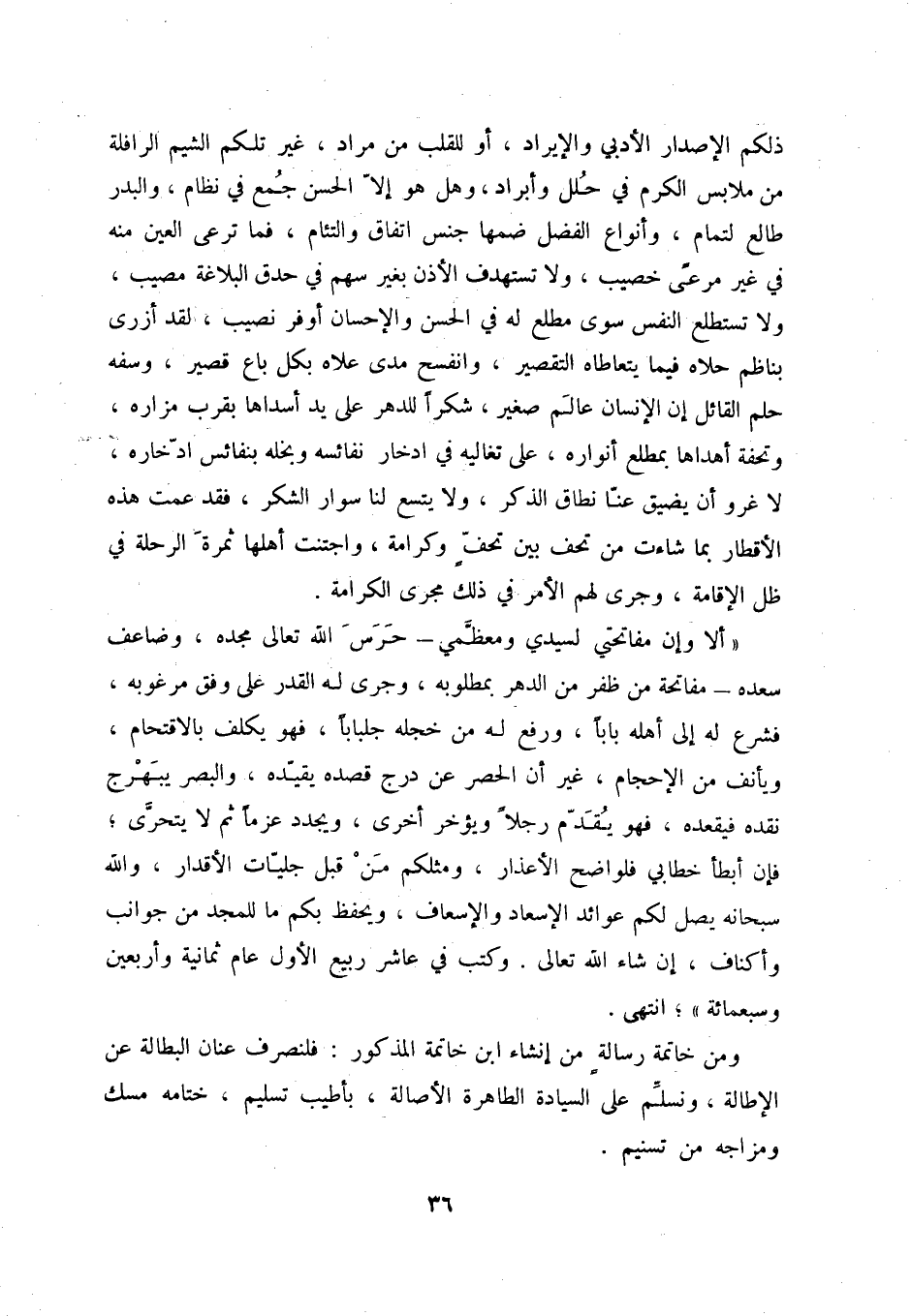 ذلكم الإصدار الأدبي والإيراد، أوللقلب من مراد غير تلكم الشيم الرافلة من ملابس الكرم في حلل وأبراد، وهل هوإلا الحسن جمع في نظام، والبدر طالع لتمام، وأنواع الفضل ضمها جنس اتفاق والتئام، فما ترعى العين منه في غير مرعى ًخصيب، ولا تستهدف الأذن بغير سهم في حدق البلاغة مصيب، ولا تستطلع النفس سوى مطلع له في الحسن والإحسان أوفر نصيب، لقد أزرى بناظم حلاه فيما يتعاطاه التقصير، وانفسح مدى علاه بكل باع قصير، وسفه حلم القائل إن الإنسان عالم صغير، شكراً للدهر على يد أسداها بقرب مزاره، وتحفة أهداها بمطلع أنواره، على تغاليه في ادخار نفائسه وبخله بنفائس ادخاره، لا غروأن يضيق عنا نطاق الذكر، ولا يتسع لنا سوار الشكر، فقد عمت هذه الأقطار بما شاءت من تحف بين تحف وكرامة، واجتنت أهلها ثمار الرحلة في ظل الإقامة، وجرى لهم الأمر في ذلك مجرى الكرامة.