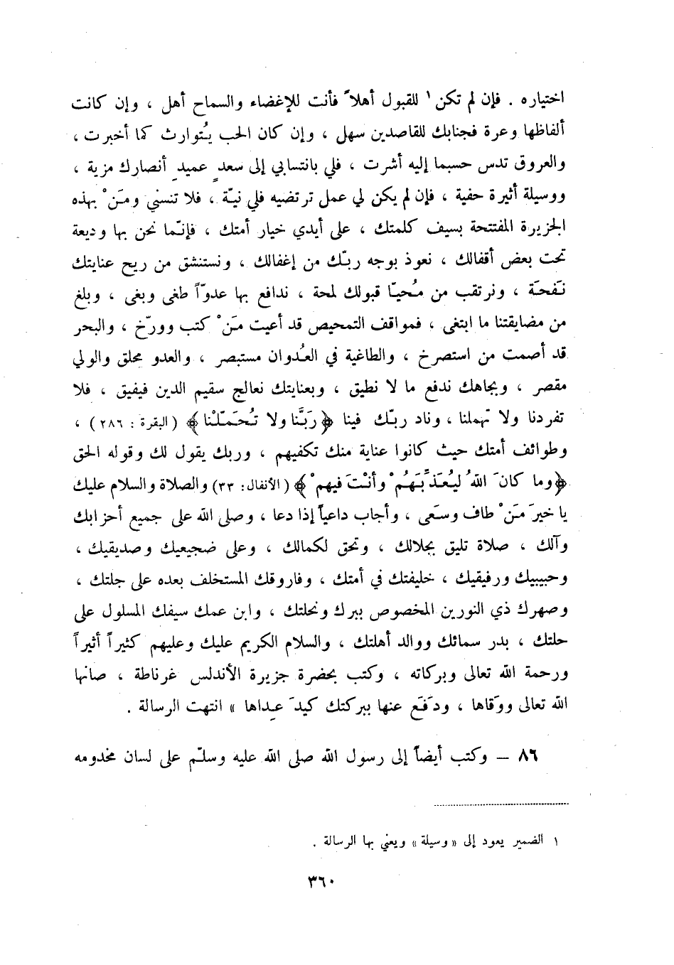 اختياره. فإن لم تكن (1) للقبول أهلاً فأنت للإغضاء والسماح أهل، وإن كانت ألفاظها وعرة فجنابك للقاصدين سهل، وإن كان الحب يتوارث كما أخبرت، والعروق تدس حسبما إليه أشرت، فلي بانتسابي إلى سعد عميد أنصارك مزية، ووسيلة أثيرة حفية، فإن لم يكن لي عمل ترتضيه فلي نية، فلا تنسني ومن بهذه الجزيرة المفتتحة بسيف كلمتك، على أيدي خيار أمتك، فإنما نحن بها وديعة تحت بعض أقفالك، نعوذ بوجه ربك من إغفالك، ونستنشق من ريح عنايتك نفحة، ونرتقب من محيا قبولك لمحة، ندافع بها عدواً طغى وبغى، وبلغ نم مضايقتنا ما ابتغى، فمواقف التمحيص قد أعيت من كتب وورخ، والبحر قد أصمت من استصرخ، والطاغية في العدوان مستبصر، والعدومحلق والولي مقصر، وبجاهك ندفع ما لا نطيق، وبعنايتك نعالج سقيم الدين فيفيق، فلا تفردنا ولا تهملنا، وناد ربك فينا " ربنا ولا تحملنا " البقرة:286، وطوائف أمتك حيث كانوا عناية منك تكفيهم، وربك يقول لك وقوله الحق " وما كان الله ليعذبهم وأنت فيهم " الانفال:33 والصلاة والسلام عليك يا خير من طاف وسعى، وأجاب داعياً إذا دعا، وصلى اله على جميع أحزابك وآلك، صلاة تليق بجلالك، وتحق لكمالك، وعلى ضجيعيك وصديقيك، وحبيبيك ورفيقيك، خليفتك في أمتك، وفاروقك المستخلف بعده على جلتك، وصهرك ذي النورين المخصوص برك ونحلتك، وابن عمك سيفك المسلول على حلتك، بدر سمائك ووالد أهلتك، والسلام الكريم عليك وعليهم كثيراً أثيراً ورحمة الله تعالى وبركاته، وكتب بحضرة جزيرة الأندلس غرناطة، صانها الله تعالى ووقاها، ودفع عنها ببركتك كيد عداها انتهت الرسالة.