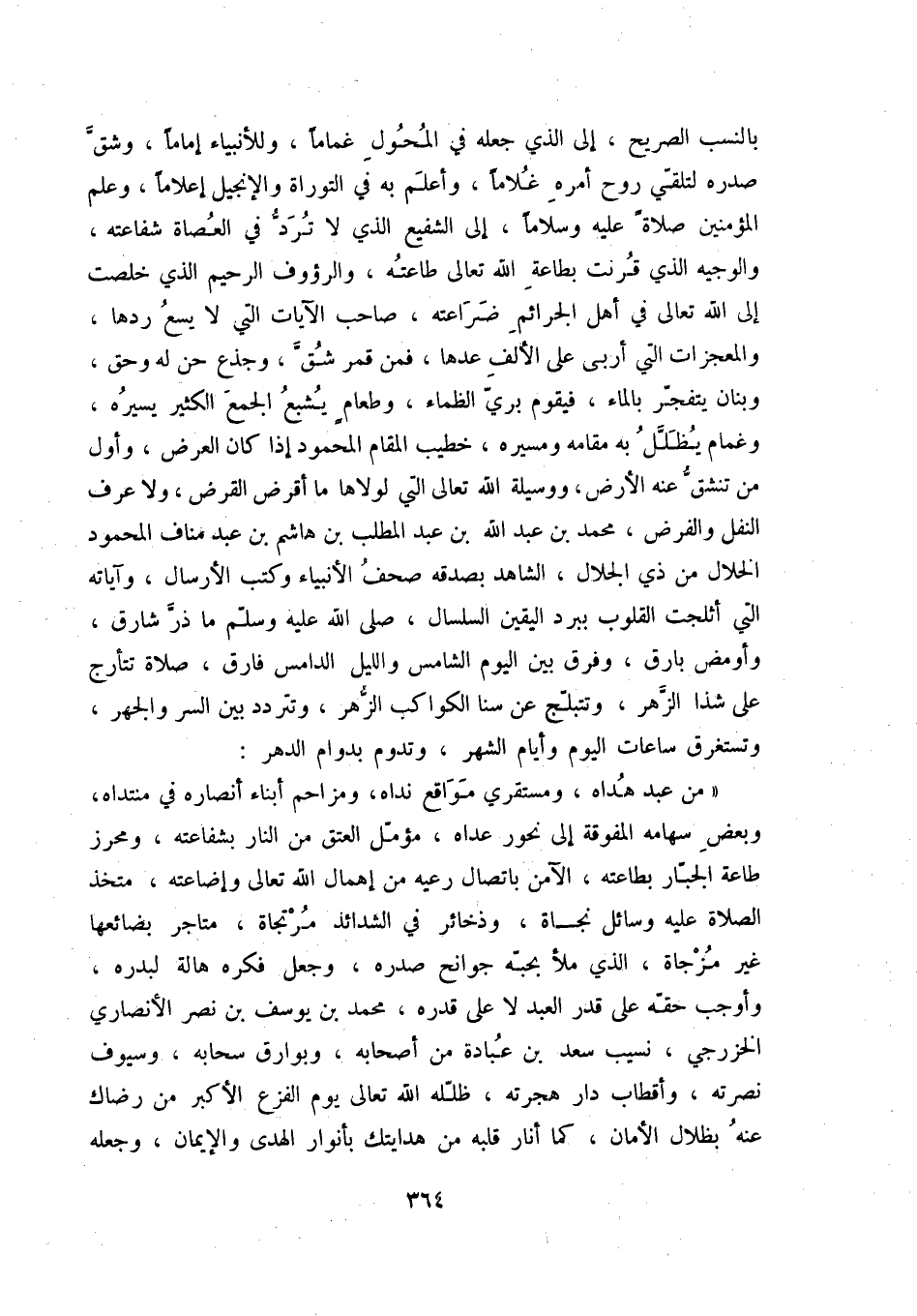 بالنسب الصريح، إلى الذي جعله في المحول غماماً، وللأنبياء إماماً، وشق صدره لتلقي روح أمره غلاماً، وأعلم به في التوراة والإنجيل إعلاماً، وعلم المؤمنين صلاة عليه وسلاماً، إلى الشفيع الذي لا ترد في العصاة شفاعته، والوجيه الذي قرنت بطاعة الله تعالى طاعته، والرؤوف الرحيم الذي خلصت إلى الله تعالى في أهل الجرائم ضراعته، صاحب الآيات التي لا يسع ردها، والمعجزات التي أربى على الألف عدها، فمن قمر شق، وجذع حن له وحق، وبنان يتفجر بالماء، فيقوم بري الظماء، وطعام يشبع الجمع الكثير يسيره، وغمام يظلل به مقامه ومسيره، خطيب المقام المحمود إذا كان العرض، وأول من تنشق عنه الأرض، ووسيلة الله تعالى التي لولاها ما أقرض القرض، ولا عرف النفل والفرض، محمد بن عبد اله بن عبد المطلب بن هاشم بن عبد مناف المحمود الخلال من ذي الجلال، الشاهد بصدقه صحف الأنبياء وكتب الإرسال، وآياته التي أثلجت القلوب ببرد اليقين السلسال، صلى الله عليه وسلم ما ذر شارق، وأومض بارق، وفرق بين اليوم الشامس والليل الدامس فارق، صلاة تتأرج على شذا الزهر، وتتبلج عن سنا الكواكب الزهر، وتتردد بين السر والجهر، وتستغرق ساعات اليوم وأيام الشهر، وتدوم بدوام الدهر: