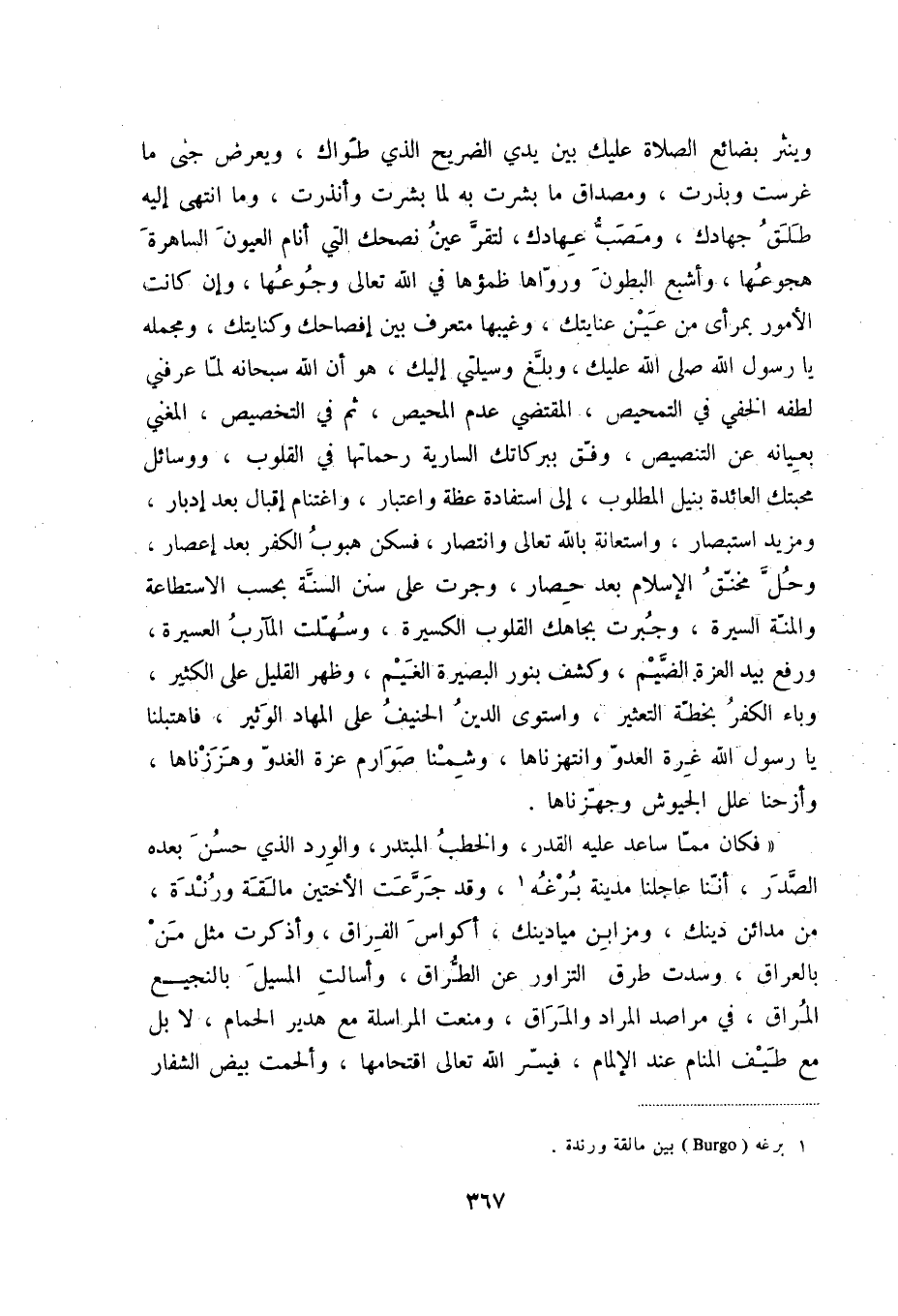 وينثر بضائع الصلاة عليك بين يدي الضريح الذي طواك، ويعرض جنى ما غرست وبذرت، ومصداق ما بشرت به لما بشرت وأنذرت، وما انتهى إليه طلق جهادك، ومصب عهادك، لتقر عين نصحك التي أنام العيون الساهرة هجوعها، وأشبع البطون، ورواها ظمؤها في الله تعالى وجوعها، وإن كانت الأمور بمرأى من عين عنايتك، وغيبها متعرف بين إفصاحك وكنايتك، ومجمله يا رسول الله صلى الله عليك، وبلغ وسيلتي إليك، هوا، الله سبحانه لما عرفني لطفه الخفي في التمحيص، المقتضي عدم المحيص، ثم في التخصيص، المغني بعيانه عن التنصيص، وفق ببركاتك السارية رحماتها في القلوب، ووسائل محبتك العائدة بنيل المطلوب، إلى استفادة عظة واعتبار، واغتنام إقبال بعد إدبار، ومزيد استبصار، واستعانة بالله تعالى وانتصار، فسكن هبوب الكفر بعد إعصار، وحل مخنق الإسلام بعد حصار، وجرت على سنن السنة بحسب الاستطاعة والمنة السيرة، وجبرت بجاهك القلوب الكسيرة، وسهلت المآرب العسيرة، ورفع بيد العزة الضيم، وكشف بنور البصيرة الغيم، وظهر القليل على الكثير، وباء الكفر بخطة التعثير، واستوى الدين الحنيف على المهاد الوثير، فاهتبلنا يا رسول الله غرة العدو وانتهزناها، وشمنا صوارم عزة الغدووهززناها، وأزحنا علل الجيوش وجهزناها.