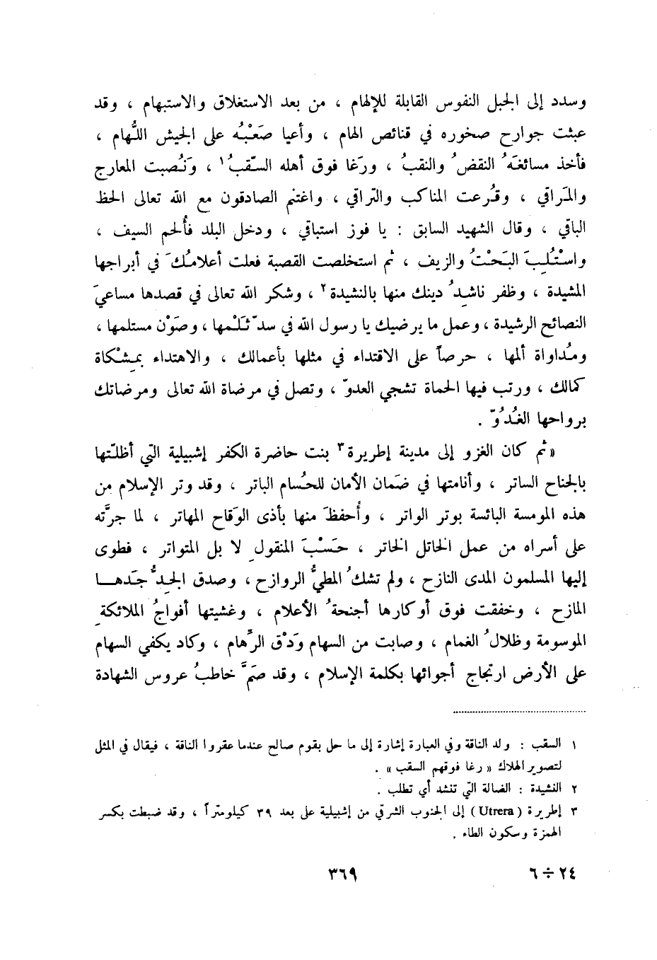 ثم كان الغزوإلى مدينة إطريرة (3) بنت حاضرة الكفر إشبيلية التي أظلتها بالجناح الساتر، وأنامتها في ضمان الأمان للحسام الباتر، وقد وتر الإسلام من هذه المومسة البائسة بوتر الواتر، وأحفظ منها بأذى الوقاح المهاتر، لما جرته على أسرة من عمل الخاتل الخاتر، حسب المنقول لا بل المتواتر، فطوى إليها المسلمون المدى النازح، ولم تشك المطي الروازح، وصدق الجد جدها المازح، وخففت فوق أوكارها أجنحة الأعلام، وغشيتها أفواج الملائكة الموسومة وظلال الغمام، وصابت من السهام ودق الرهام، وكاد يكفي السهام على الأرض ارتجاج أجوائها بكلمة الإسلام، وقد صم خاطب عروس الشهادة