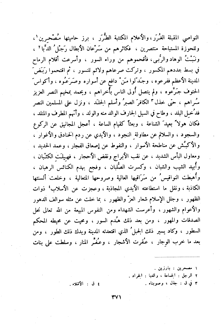 النواصي المقبلة الغرر والأعلام المكتتبة الطرر، برز حاميتها مصحرين (1) ، وللحوزة المستباحة منتصرين، فكاثرهم من سرعان الأبطال رجل الدبا (2) ، ونبت الوهاد والربى، فأقحموهم من وراء السور، وأسرعت أقلام الرماح في بسط عددهم المكسور، وتركت صرعاهم ولائم للنسور، ثم اقتحموا ربض المدينة الأعظم ففرعوه، وجدلوا من دافع عن أسواره وصرعوه، وأكواس الحتوف جرعوه، ولم يتصل أولى الناس بأخراهم، ويحمد بمخيم النصر العزيز سراهم، حتى خذل (3) الكافر الصبر وأسلم الجلد، ونزل على المسلمين النصر فدخل البلد، وطاح في السيل الجارف الوالد منه والولد، وأتهم المطرف والمتلد، فكان هولاً بعيد الشناعة، وبعثاً كقيام الساعة، أعجل المجانيق عن الركوع والسجود، والسلالم عن مطاولة النجود، والأيدي عن ردم الخنادق والأغوار، والأكبش عن مناطحة الأسوار، والنفوط عن إصعاق الفجار، وعمد الحديد، ومعاول البأس الشديد، عن نقب الأبراج ونقض الأحجار، فهيلت الكثبان، وأبيد الشيب والشبان، وكسرت الصلبان، وفجع بهدم الكنائس الرهبان، وأهبطت النواقيس من مراقيها العالية وصروحها المتعالية، وخلعت ألسنتها الكاذبة، ونقل ما استطاعته الأيدي المجاذبة، وعجزت عن الأسلاب (4) ذوات الظهور، وجلل الإسلام شعار العز والظهور، بما خلت عن مثله سوالف الدهور والأعوام والشهور، وأعرست الشهداء ومن النفوس المبيعة من الله تعالى نحل الصدقات والمهور، ومن بعد ذلك هدم السور، ومحيت عن محيطه المحكم السطور، وكاد يسير ذلك الجبل الذي اقتعدته ويدك ذلك الطور، ومن بعد ما خرب الوجار، عقرت الأشجار، وعفر المنار، وسلطت على بنات