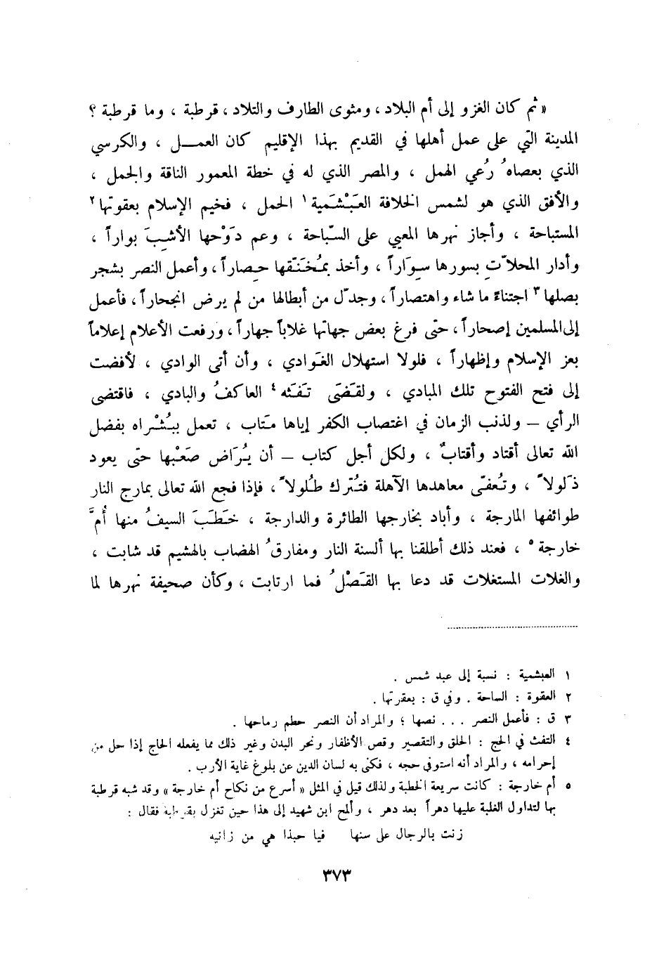 ثم كان الغزوإلى أم البلاد، ومثوى الطارف والتلاد، قرطبة، وما قرطبة المدينة التي على عمل أهلها في القديم بهذا الإقليم كان اعمل، والكرسي الذي بعصاه رعي الهمل، والمصر الذي له في خطة المعمور الناقة والجمل، والأفق الذي لشمس الخلافة العبشمية (1) الحمل، فخيم الإسلام بعقوتها (2) المستباحة، وأجاز نهرها المعيي على السباحة، وعم دوحها الأشب بواراً، وأدار المحلات بسورها سواراً، وأخذ بمخنقها حصاراً، وأعمل النصر بشجر يصلها (3) اجتناءً ما شاء واهتصاراً، وجدل من أبطالها من لم يرض انحجاراً، فأعمل إلى المسلمين إصحاراً، حتى فرغ بعض جهاتها غلاباً جهاراً، ورفعت الأعلام إعلاماً بعز الإسلام وإظهاراً، فلولا استهلال الغوادي، وأن أتى الوادي، فأفضت إلى فتح الفتوح تلك المبادي، ولقضى تفثه (4) العاكف والبادي، فاقتضى الرأي ولذنب الزمان في اغتصاب الكفر إياها متاب، تعمل ببشراه بفضل الله تعالى أقتاد وأقتاب، ولكل أجل كتاب أن يراض صعبها حتى يعود ذلولاً، وتعفى معاهدها الآهلة فتترك طلولاً، فإذا فجع الله تعالى بمارج النار طوائفها المارجة، وأباد بخارجها الطائرة والدارجة، خطب السيف منها أم خارجة (5) ، فعند ذلك أطلقنا بها ألسنة النار ومفارق الهضاب بالهشيم قد شابت، والغلات المستغلات قد دعا بها القصل فما ارتابت، وكأن صحيفة نهرها لما