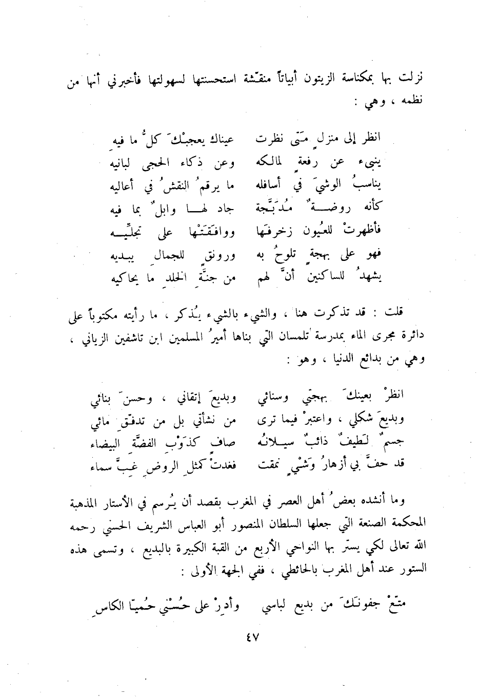 يشهد للساكنين أن لهم ... من جنة الخلد ما يحاكيه قلت: قد تذكرت هنا، والشيء بالشيء يذكر، ما رأيته مكتوباً على دائرة مجرى الماء بمدرسة تلمسان التي بناها أمير المسلمين ابن تاشفين الزياني، وهي من بدائع الدنيا، وهو: