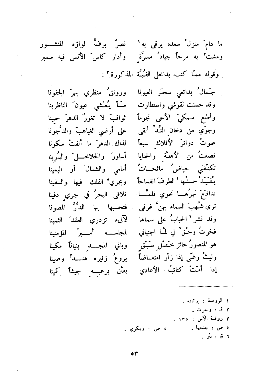 ومشت (2) به مرحاً جياد مسرةٍ ... وأدار كأس الأنس فيه سمير وقوله مما كتب بداخل القبة المذكورة (3) :
