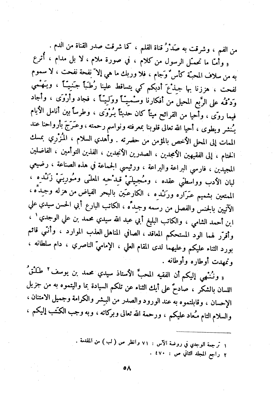 " وننهي إليكم أن الفقيه المحب الأستاذ سيدي محمد بن يوسف (2) طلق اللسان بالشكر، صادح على أيك الثناء عن تلكم السيادة بما واليتموه به من جزيل الإحسان، وقابلتموه به عند الورود والصدر من البشر والكرامة وجميل الامتنان، والسلام التام معاد عليكم، ورحمة الله تعالى وبركاته، وبه وجب الكتب إليكم،