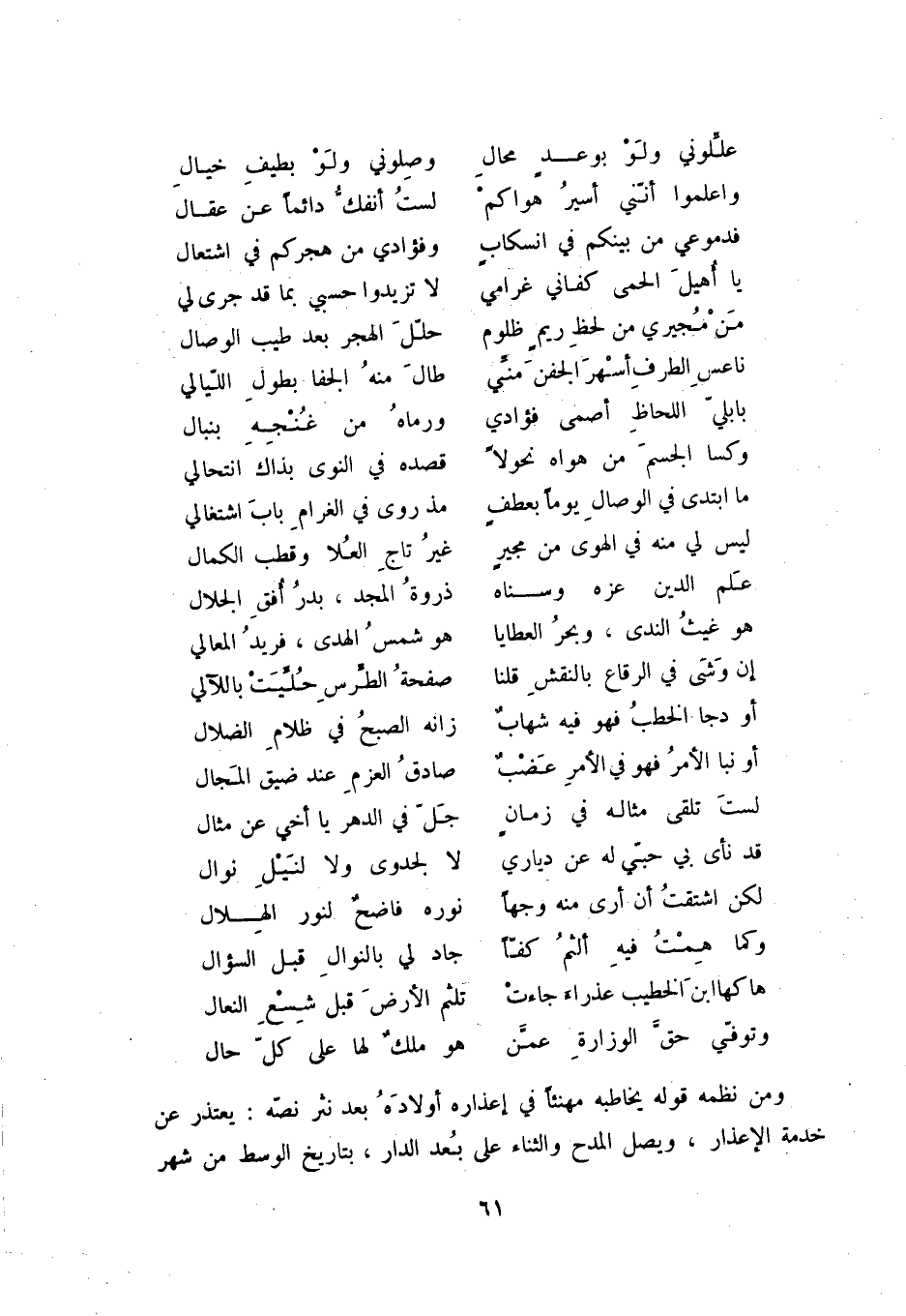 وتوفي حق الوزارة عمن ... هو ملك لها على كل حال ومن نظمه قوله يخاطبه مهنئاً في إعذاره أولاده بعد نثر نصه: يعتذر عن خدمة الإعذار، ويصل المدح والثناء على بعد الدار، بتاريخ الوسط من شهر