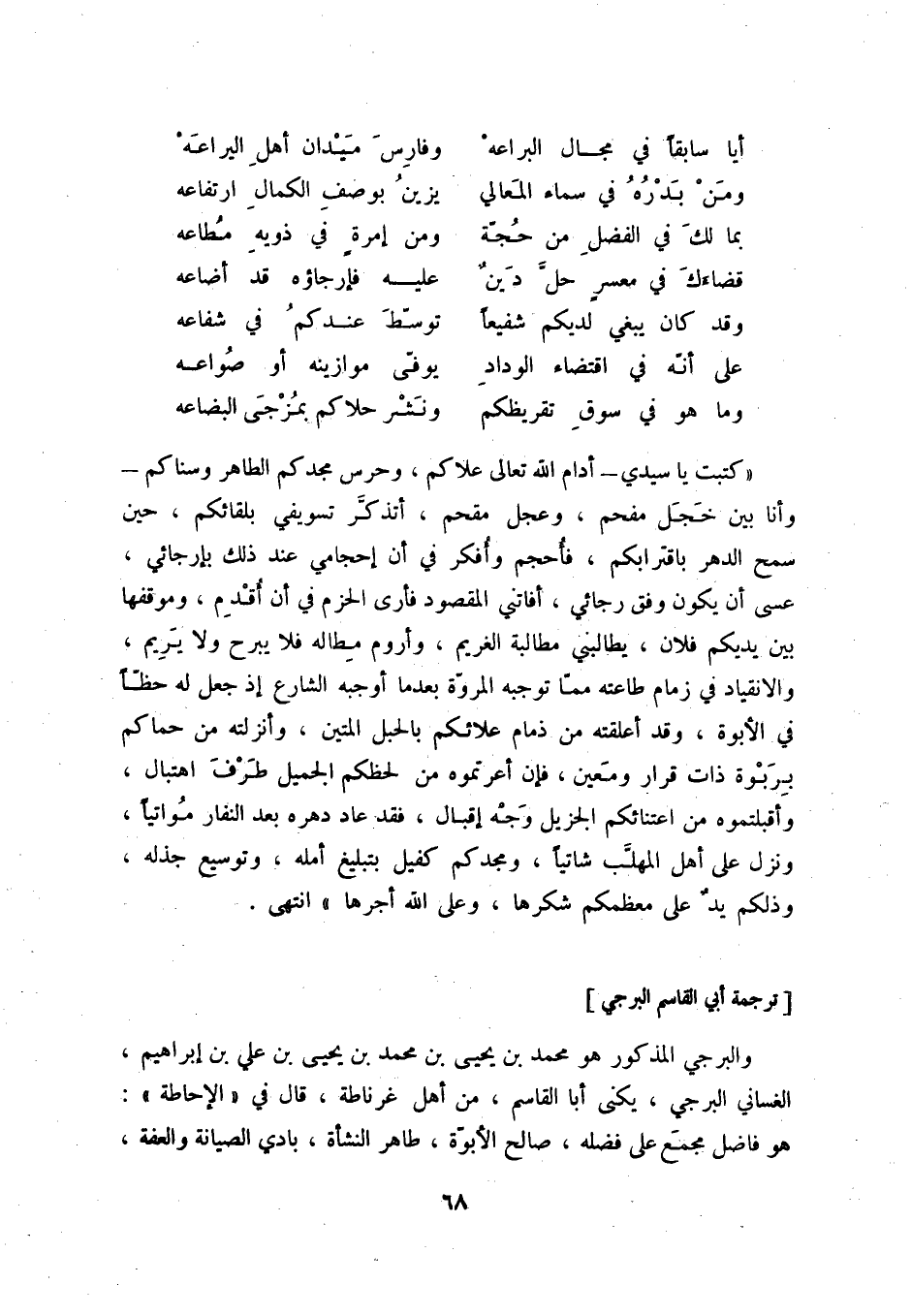 وما هوفي سوق تقريظكم ... ونشر حلالكم بمزجى البضاعه " كتبت يا سيدي أدام الله تعالى علاكم، وحرس مجدكم الطاهر وسناكم، وأنا بين خجل مفحم وعجل مقحم، أتذكر تسويقي بلقائكم، حين سمع الدهر بإقترابكم، فأحجم وأفكر في أن إحجامي عند ذلك بإرجائي، عسى أن يكون وفق رجائي، أفاتني المقصود فأرى الحزم في أن أقدم، وموقفها بين يديكم فلان، يطالبني مطالبة الغريم، وأروم مطاله فلا يبرح ولا يريم، والانقياد في زمام طاعته مما توجبه المروة بعدما أوجبه الشارع إذ جعل له حظاً في الأبوة، وقد أعلقته من ذمام علائكم بالحبل المتين، وأنزلته من حماكم بربوة ذات قرار ومعين، فإن أعرتموه من لحظكم الجميل طرف اهتبال، وأقبلتموه من اعتنائكم الجزيل وجه إقبال، فقد عاد دهره بعد النفار مواتياً ونزل على أهل المهلب شاتياً ومجدكم كفيل بتبليغ أمله، وتوسيع جذله، وذلكم يد على معظمكم شكرها، وعلى الله أجرها "؛ انتهى.