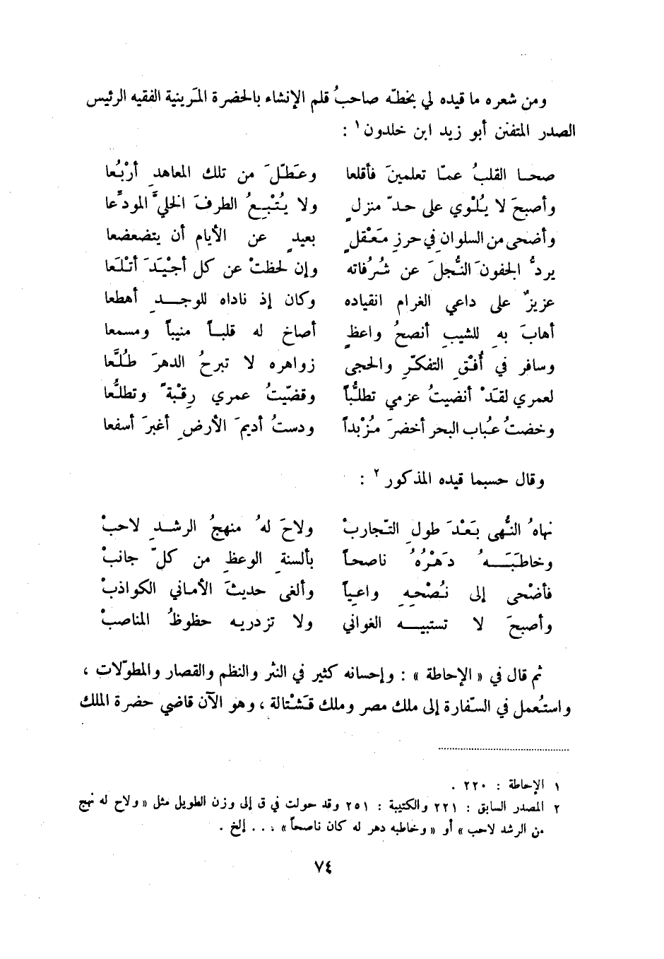 وأصبح لا تستبيه الغواني ... ولا تزدريه حظوظ المناصب ثم قال في الإحاطة ": وإحسانه كثير في النثر والنظم والقصار والمطولات واستعمل في السفارة إلى ملك مصر وملك قشتالة وهوالآن قاضي حضرة الملك