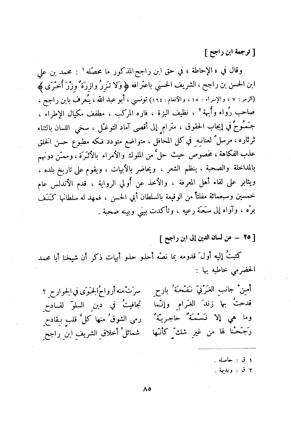وقال في " الإحاطة " في حق ابن راجح المذكور ما محصله (1) : محمد بن علي بن الحسن بن راجح، باعترافه " ولا تزر وازرة وزر أخرى " (الزمر:7، الإسراء:15، والأنعام:164) تونسي، أبوعبد الله، يعرف بابن راجح، صاحب رواء وأبهة (2) ، نظيف البزة، فاره المركب، مطفف مكيال الإطراء، جموح في إيجاب الحقوق، مترام إلى أقصى أماد التوغل، سخي السان بالثناء ثرثاره، مرسل لعنانه في كل المحافل، متواضع متودد فكه مطبوع حسن الخلق عذب الفكاهة، مخصوص حيث حل من الملوك والأمراء بالإثرة، وممن دونهم بالمداخلة والصحبة، ينظم الشعر ويحاضر بالأبيات، ويقوم على تاريخ بلده، ويثابر على لقاء أهل المعرفة، والأخذ عن أولي الرواية، قدم الأندلس عام خمسين وسبعمائة مفلتاً من الوقيعة بالسلطان ابي الحسن، فمهد له سلطانها كنف بره، وآواه لإلى سعة رعيه، وتأكدت بيني وبينه صحبة.