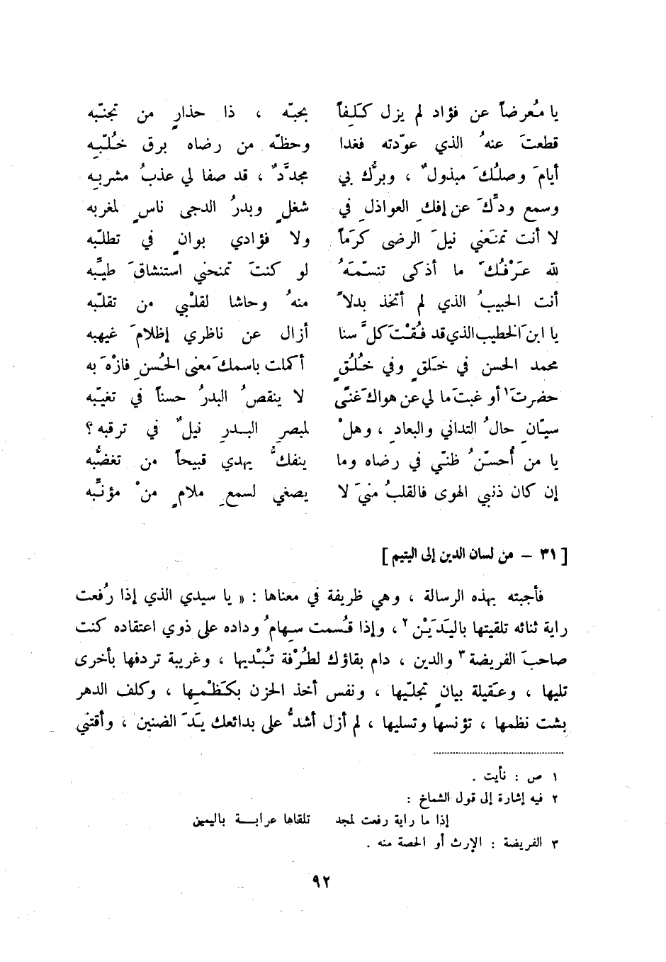 فأجبته بهذه الرسالة، وهي ظريفة في معناه: يا سيدي الذي إذا رفعت راية ثنائه تلقيتها باليدين (2) ، وإذا قسمت سهام وداده على ذوي اعتقاده كنت صاحب الفريضة والدين (3) ، دام بقاؤك لطرفة تبديها، وغريبة تردفها بأخرى تليها، وعقيلة بيان تجليها، ونفس أخذ الحزن بكظمها، وكلف الدهر بشت نظمها، تؤنسها وتسليها، لم أزل أشد على بدائعك يد الضنين، وأقتني