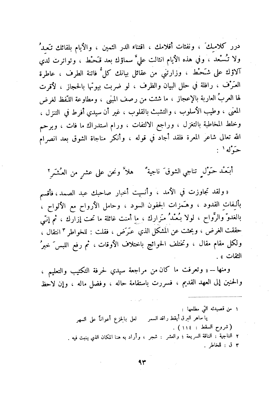 درر كلامك، ونفثات أقلامك، اقتناء الدر الثمين، والأيام بلقائك تعد ولا تسعد، وفي هذه الأيام انثالت علي سماؤك بعد القحط، وتواترت لدي آلاؤك على شحط، وزارتني من عقائل بيانك كل فاتنة الطرف، عاطرة العرف، رافلة في حلل البيان والظرف، لوضربت بيوتها بالحجاز، لأقرت لها العرب العاربة بالإعجاز، ما شئت من رصف المبنى، ومطاوعة اللفظ لغرض المعنى، وطيب الأسلوب، والتشبث بالقلوب غير أن سيدي أفرط في التنزل وخلط المخاطبة بالتغزل وراجع الالتفاف ورام استدراك مافات ويرحم الله تعالى شاعر المعرة فلقد أجاد في قوله وانكر مناجاة الشوق بعد انصرام حوله (1) :