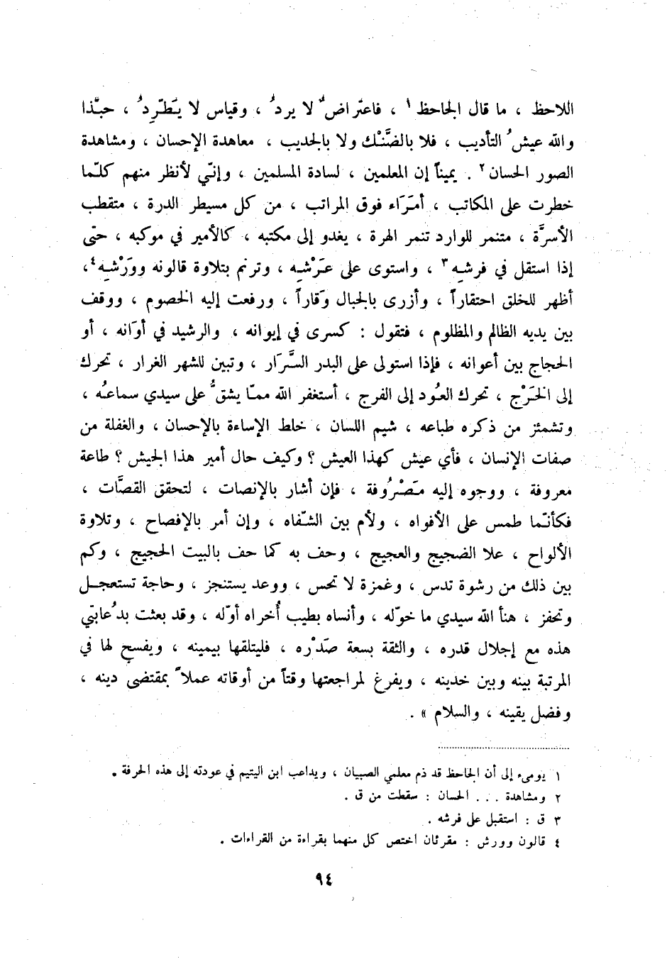اللاحظ ما قال الجاحظ (1) ، فاعتراض لا يرد وقياس لا يطرد حبذا والله عيش التأديب فلا بالضنك ولا بالجديب معاهدة الإحسان ومشاهدة الصور الحسان (2) . يميناً إن المعلمين لسادة المسلمين وإني لأنظر منهم كلما خطرت على المكاتب أمراء فوق المراتب من كل مسيطر الدرة متقطب الأسرة متنمر للوارد تنمر الهرة يغدوإلى مكتبه كالأمير في موكبه حتى إذا أستقل في فرشه (3) ، واستوى على عرشه وترنم بتلاوة قالونه وورشه (4) ، أظهر للخلق احتقار أوأزرى بالجبال وقاراً ورفعت إليه الخصوم ووقف بين يديه الظالم والمظلوم فتقول كسرى في إيوانه والرشيد في أوانه أوالحجاج بين أعوانه فإذا استولى على البدر السرار وتبين للشهر الغرار تحرك إلى الخرج تحرك العود إلى الفرج استغفر الله مما يشق على سيدي سماعه وتشمئز من ذكره طباعه شيم اللسان خلط الإساءة بالإحسان والغفلة من صفات الإنسان فأي عيش كهذا العيش وكيف حال أمير هذا الجيش طاعة معروفة ووجوه إليه مصروفة فإن أشار بالإنصات لتحقق القصات فكأنما طمس على الأفواه ولأم بين الشفاه وإن أمر بالإفصاح وتلاوة الألواح علا الضجيج والعجيج وحف به كما حف بالبيت الحجيج وكم من بين ذلك رشوة تدس وغمزة لا تحس ووعد يستنجز وحاجة تستعجل وتحفز هنأ الله سيدي ما خوله أنساه بطيب أخراه أوله وقد بعثت بدعابتي مع إجلال قدره والثقة وبسعة صدره فليتها بيمينه ويفسح لها في المرتبة بينه وبين خدينه ويفرغ لمراجعتها وقتاً من أوقاته عملاً بمقتضى دينه وفضل يقينه؛ والسلام ".