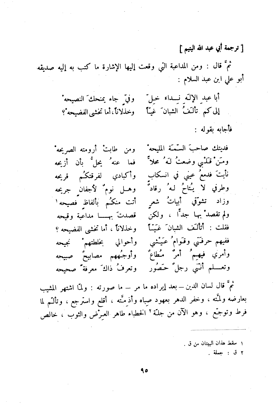 وتعلم أنني رجلٌ حصور ... وتعرف ذاك معرفةً صحيحة ثم قال لسان الدين - بعد إيراده ما مر - ما صورته ولم اشتهر المشيب بعارضه ولمته وخفر الدهر بعهود صباه وأذمته أقلع استرجع وتألم لما فرط وتوجع وهوالآن من جلة (2) الخطباء طاهر العرض والثوب خالص