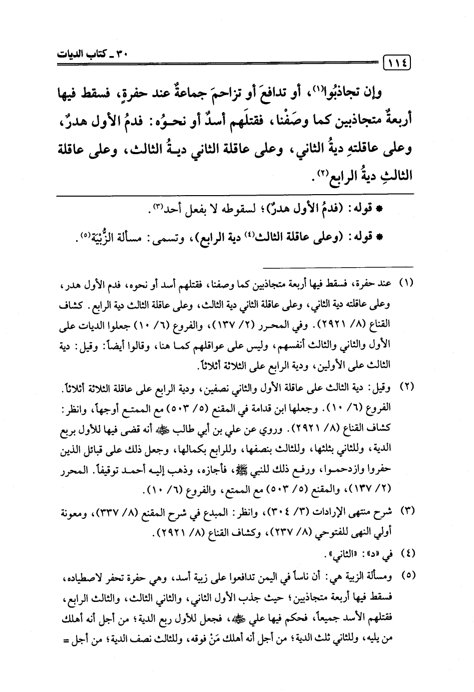 (¬5) ومسألة الزبية هي: أن ناسًا في اليمن تدافعوا على زبية أسد، وهي حفرة تحفر لاصطياده، فسقط فيها أربعة متجاذبين؛ حيث جذب الأول الثاني، والثاني الثالث، والثالث الرابع، فقتلهم الأسد جميعًا، فحكم فيها علي -رضي اللَّه عنه-، فجعل للأول ربع الدية؛ من أجل أنه أهلك من يليه، وللثاني ثلث الدية؛ من أجل أنه أهلك مَنْ فوقه، وللثالث نصف الدية؛ من أجل =