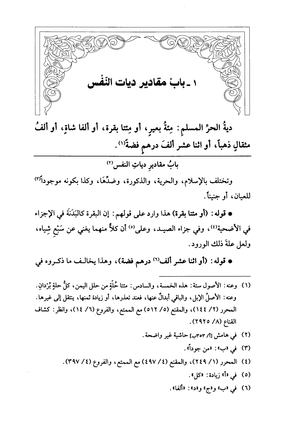 ديةُ الحرِّ المسلم: مِئةُ بعيرٍ، أو مِئتا بقرة، أو ألفا شاةٍ، أو ألفُ مثقالٍ ذهبًا، أو اثنا عشر ألفَ درهمٍ فضةً (¬1).