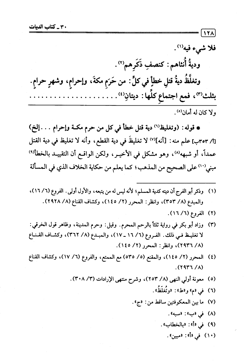* قوله: (وتغليظ (¬6) دية قتل خطأ في كل من حرم مكة وإحرام. . . إلخ) علم منه: [أنه] (¬7) لا تغليظَ في دية القطع، وأنه لا تغليظ في دية القتل عمدًا، أو شبهه (¬8)، وهو مشكل في الأخير، ولكن الواقع أن التقييد بالخطأ (¬9) مبني (¬10) على الصحيح من المذهب؛ كما يعلم من حكاية الخلاف الذي في المسألة