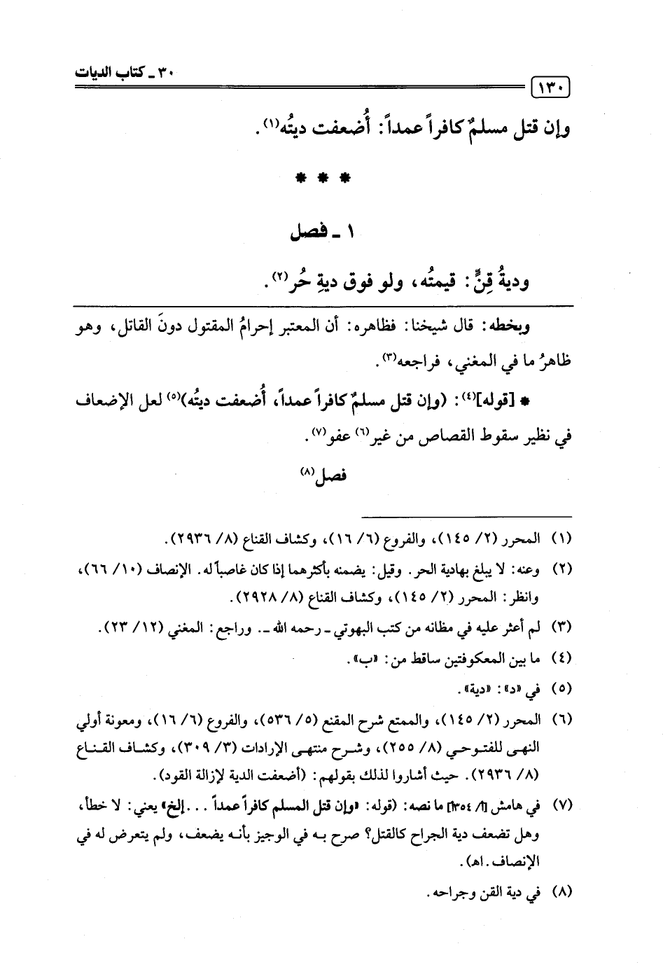 (¬6) المحرر (2/ 145)، والممتع شرح المقنع (5/ 536)، والفروع (6/ 16)، ومعونة أولي النهى للفتوحي (8/ 255)، وشرح منتهى الإرادات (3/ 309)، وكشاف القناع (8/ 2936). حيث أشاروا لذلك بقولهم: (أضعفت الدية لإزالة القود).